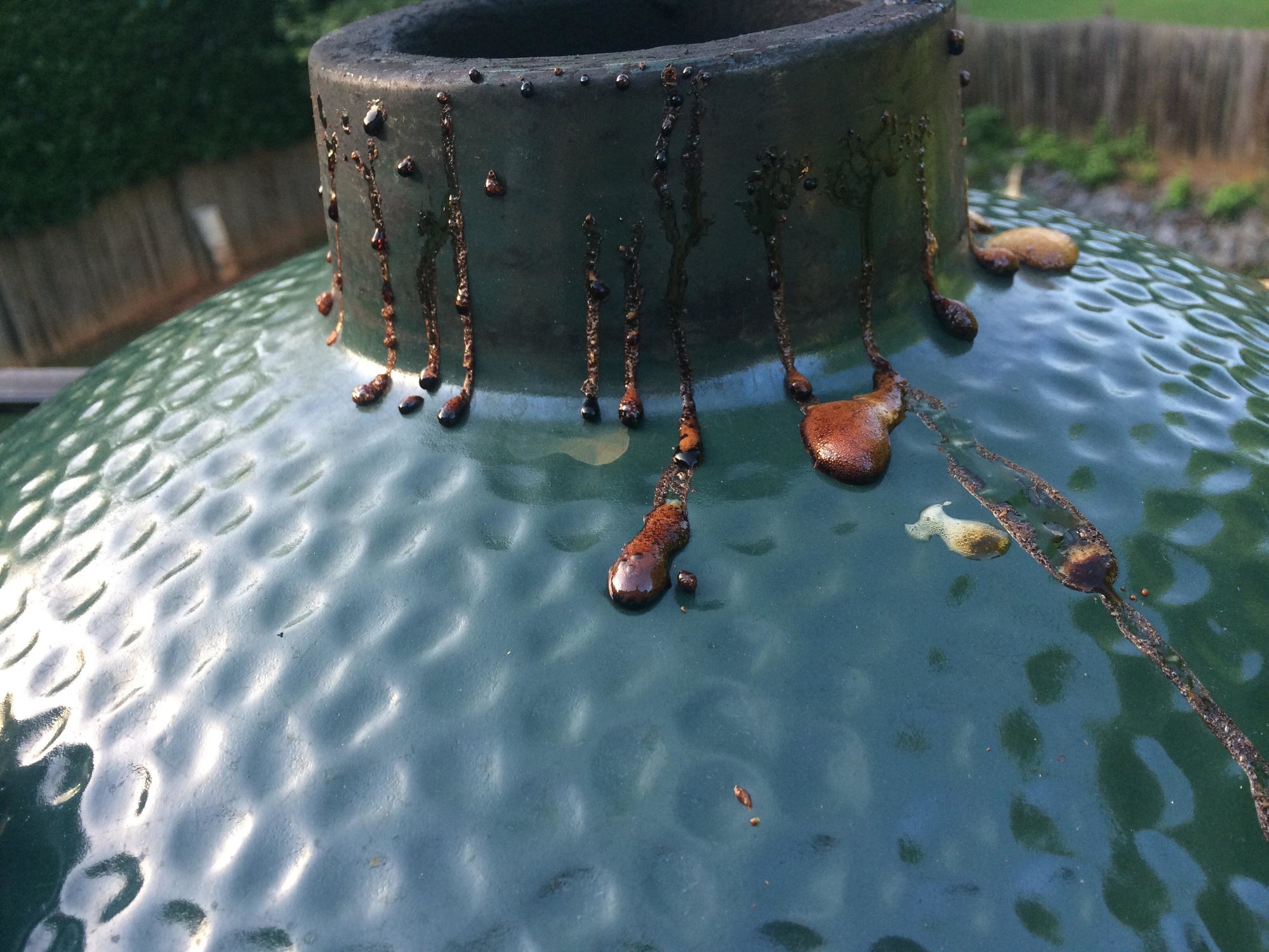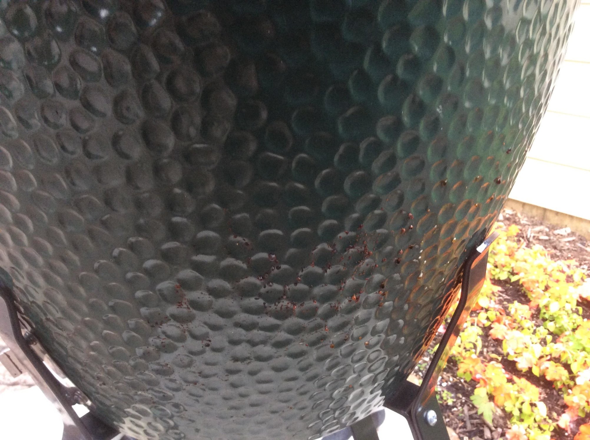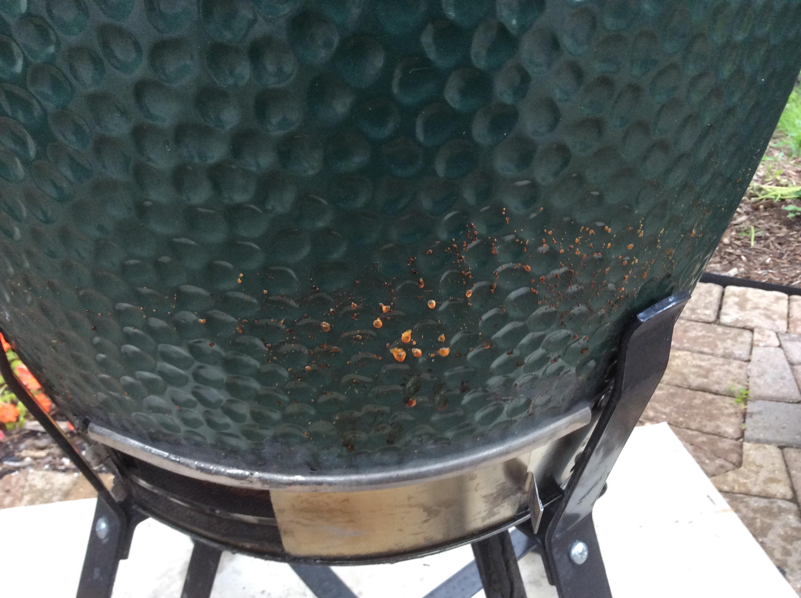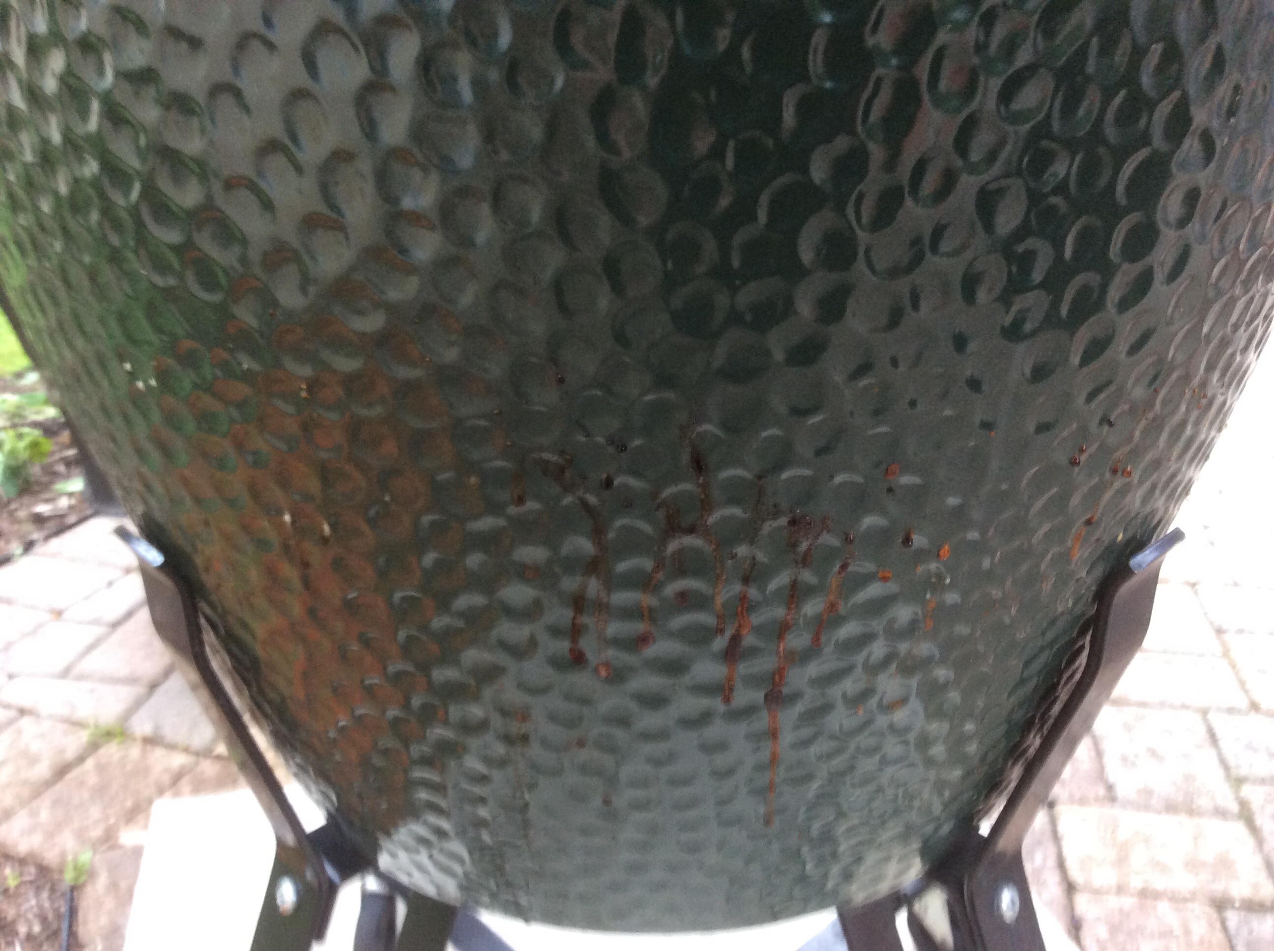 I have had my Lg bge for over 3 years. Tonight while i was heating up the egg for some pizza's i noticed grease drops seaping out of the sides of my egg. It looks like tiny little pin holes that the grease is coming out of. I cleaned my egg last week. Anyone else have this happen?