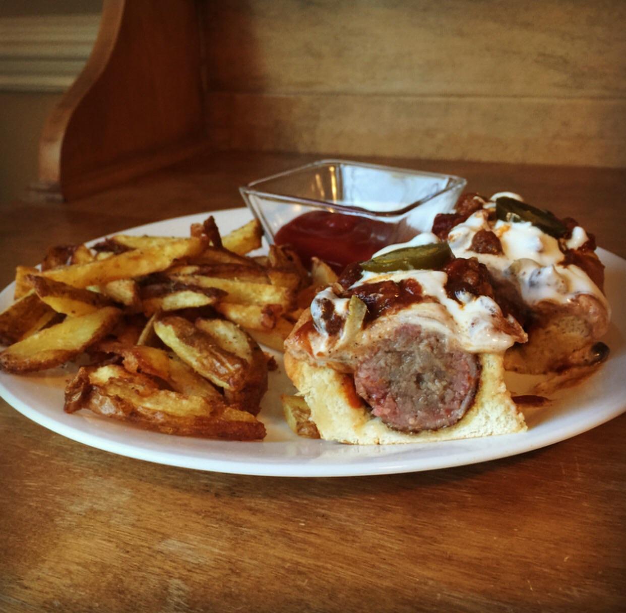 The wife and I went to World Market earlier and picked up a few things.  I discovered Dave's Insanity Hurtin' Habanero Honey Mustard.  CRAZY good!!  Painted some Bacon Wrapped Beer Brats with it tonight.  Smoked those and some Nathan's Beef Franks with some JD Whiskey Barrel Chips.  The Brats were served on toasted split top buns and topped with Beer Cheese, homemade Chipotle Chili, Sour Cream and Jalapeños.  The wife made homemade Cold Oil Fries.  Bestest fries ever.  :flushed: