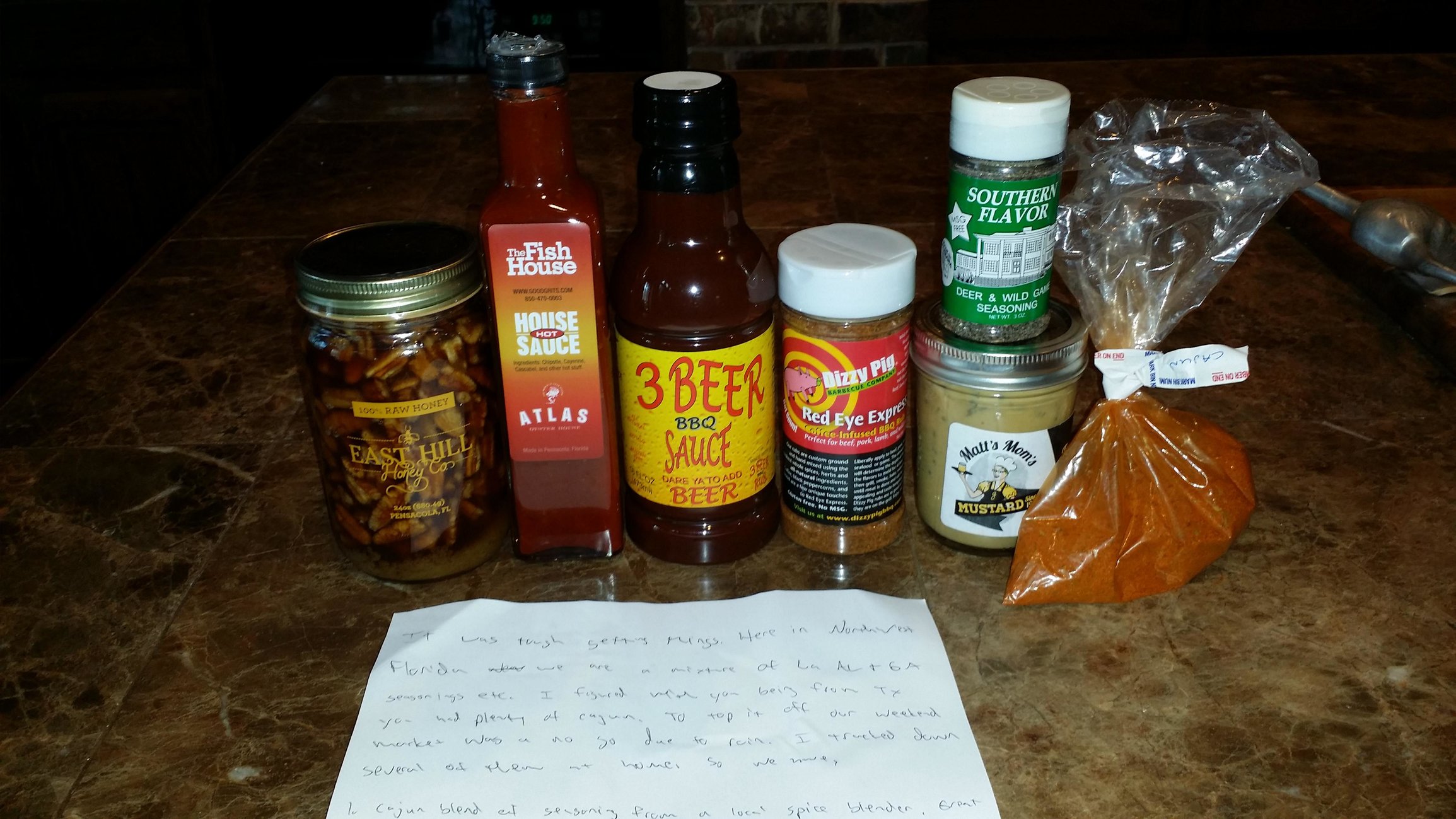 Just got back in town from a long holiday weekend and had my package from @JohnInCarolina  what a lucky guy I am. He sent all kinds of local rubs and sauces and even include a " special" meet finishing sauce. Can't wait to try them