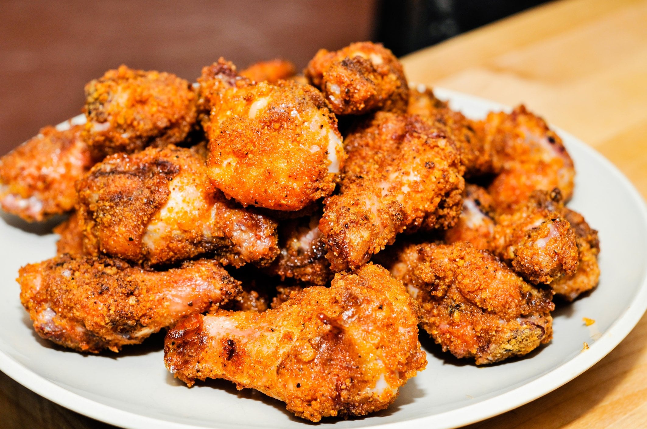 I cooked wings two ways. The first batch was just straight plowboys yardbird and the second was plowboys with a bag of pork rinds ground down with a vitamix. I mixed up some egg and milk and coated the wings in the dust. The pork rinds really made the wings crispy!!!
