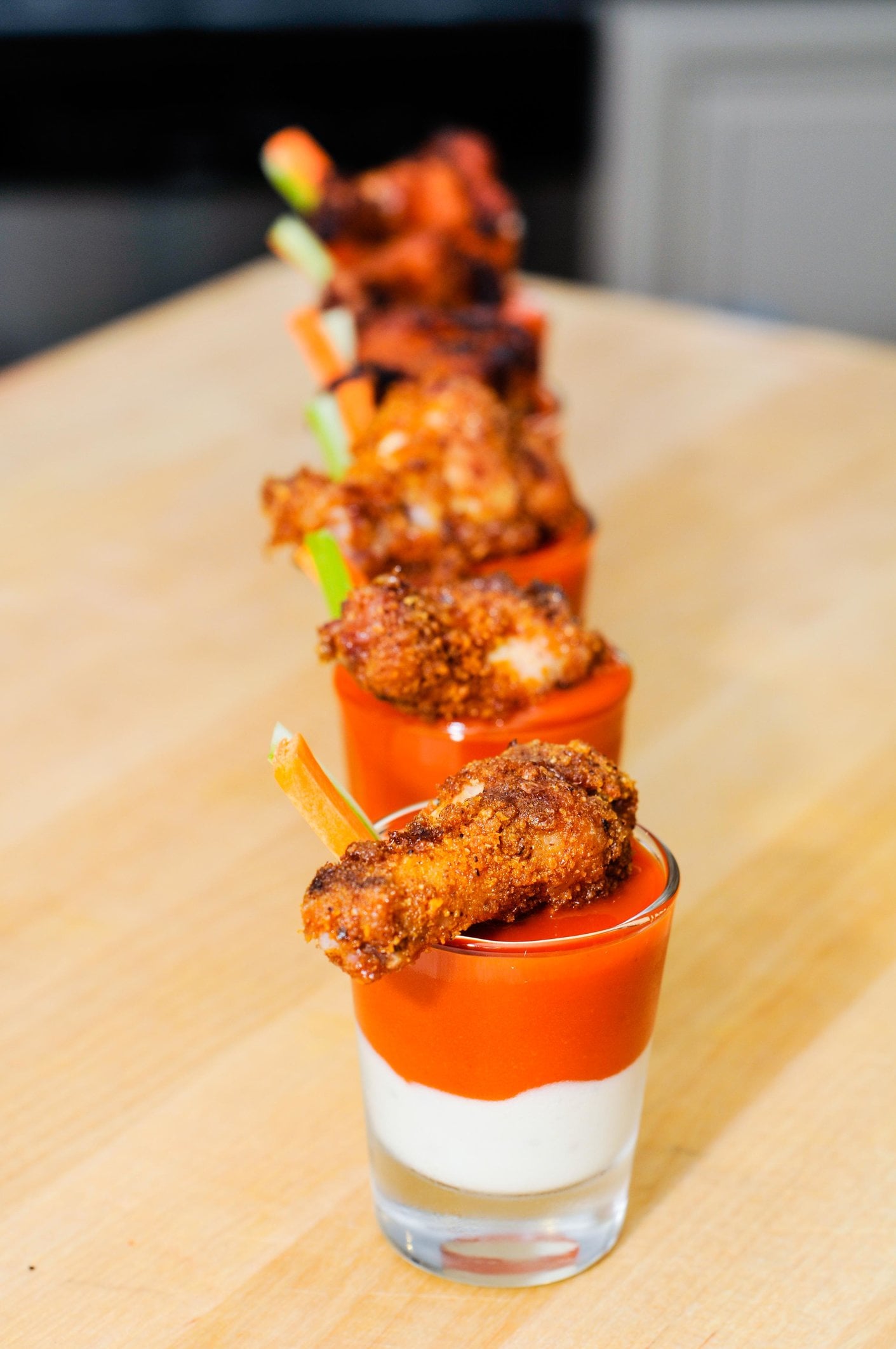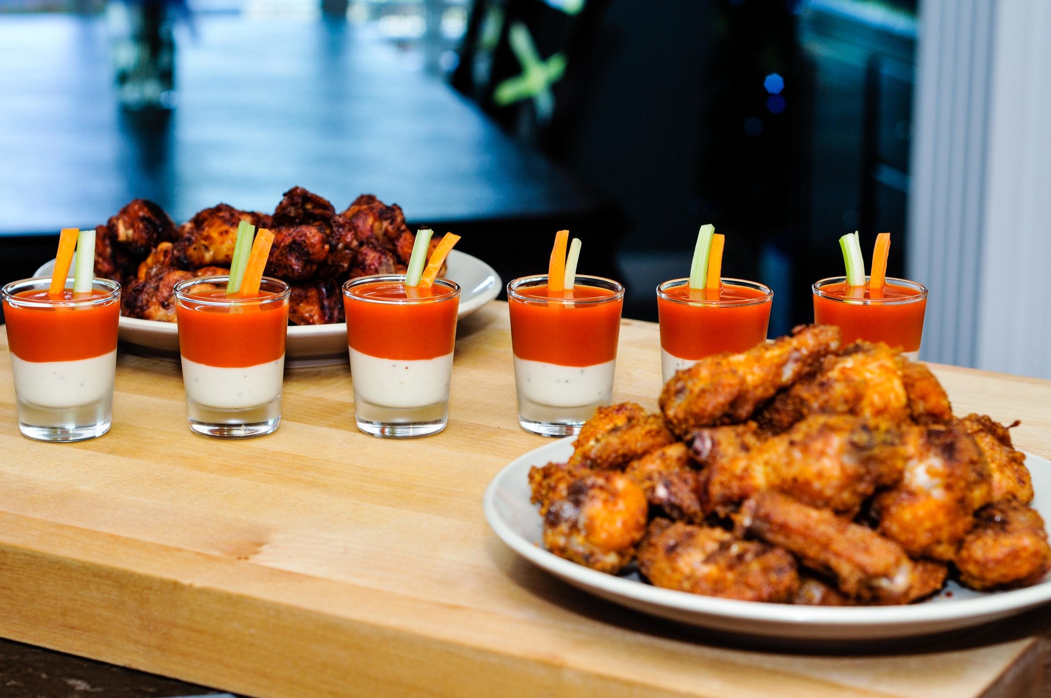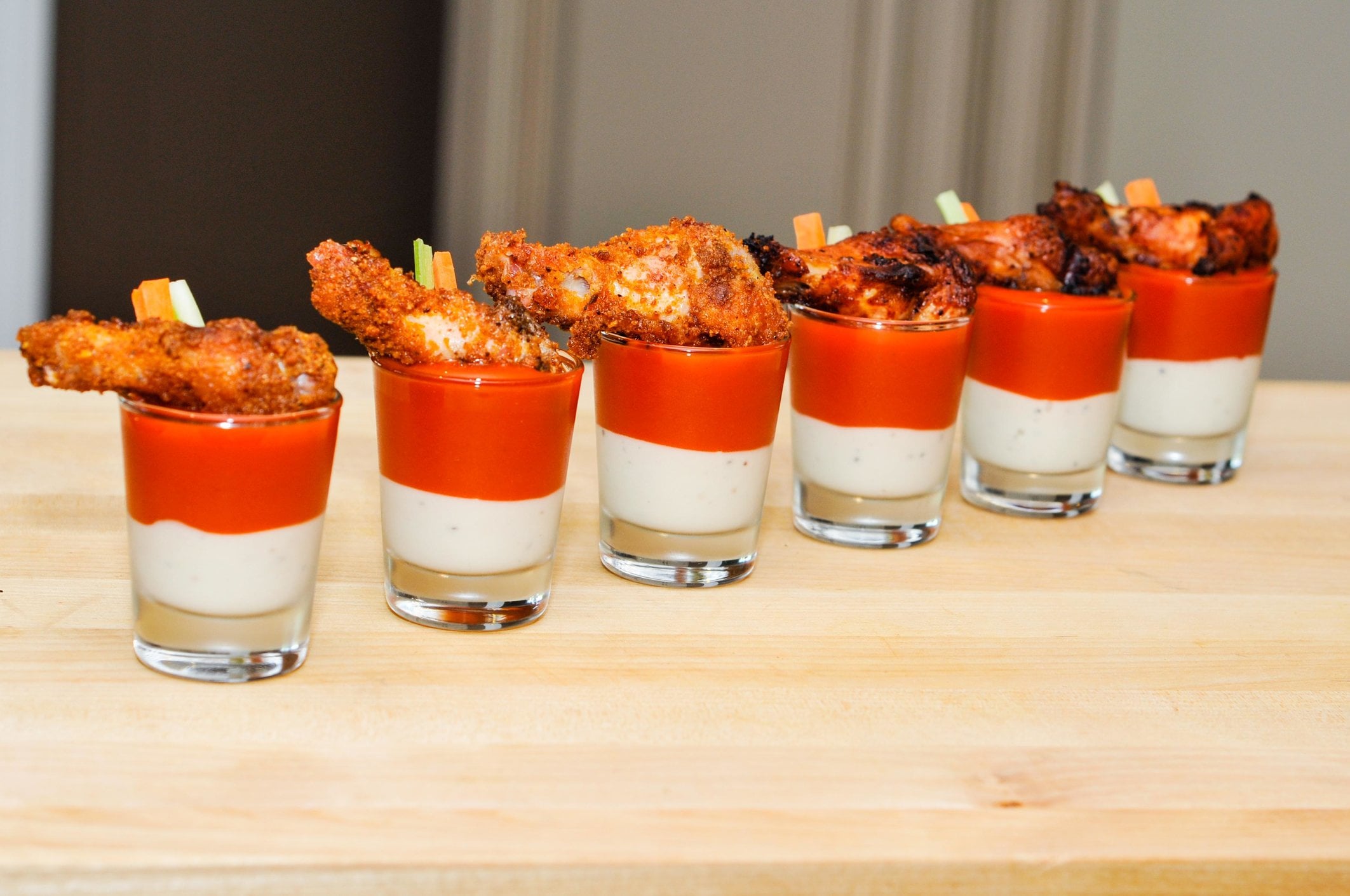 And for the creative side, I used some shot glasses with blue cheese and franks buffalo hot sauce, celery and carrot.