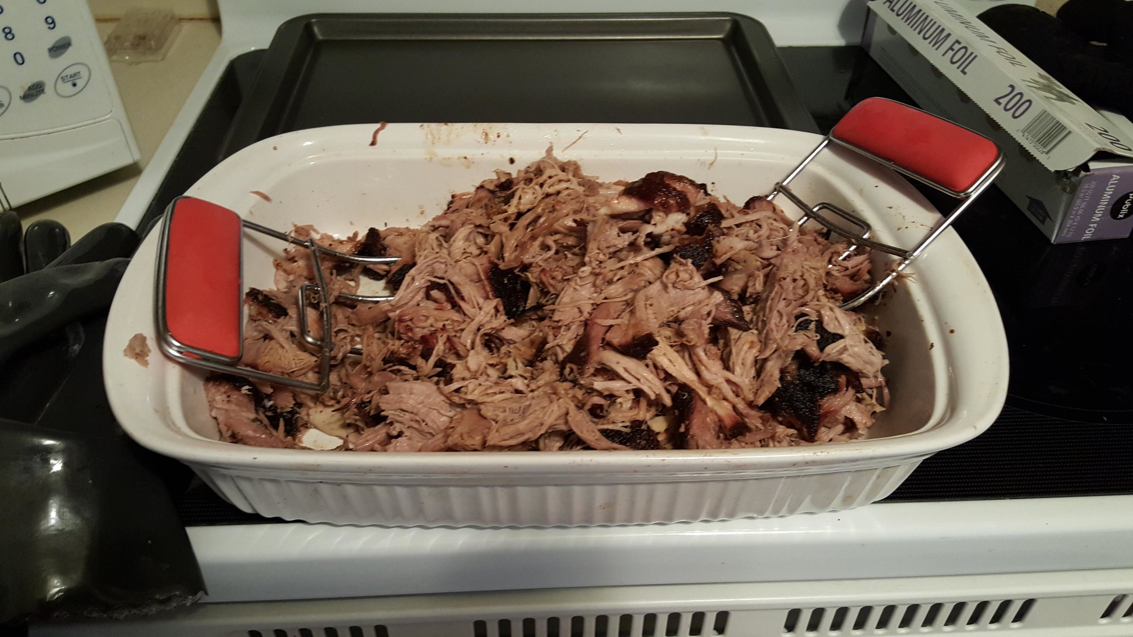 First time doing a smoke. Picked Boston butts for pulled pork cause it's just delicious. The smaller of the two came off at 12:09pm with an IT of 203. I put it in FTC and just pulled it. Used a BBQ hog rub and apple wood and hickory.