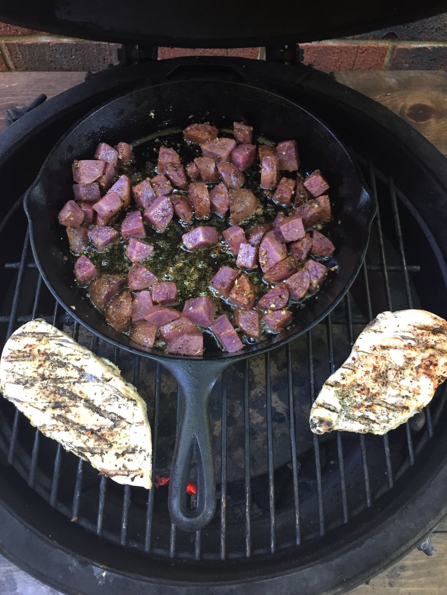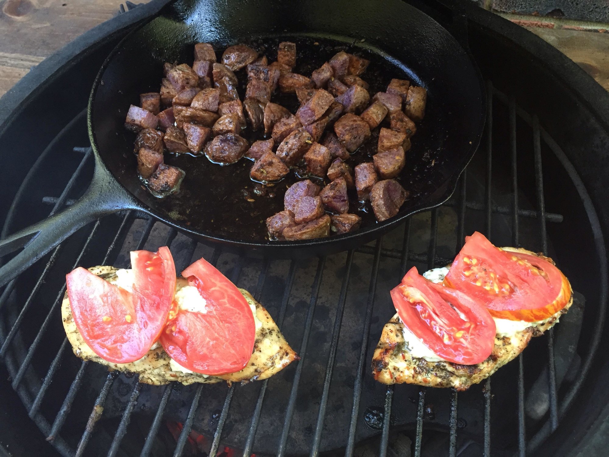 Potatoes on in CI skillet indirect 425, chicken to follow shortly, planning to finish with a little smear of cheese and top with tomatoes for last few minutes on egg. Extra tomatoes with evoo, balsamic, SP inside will top with more goat cheese.