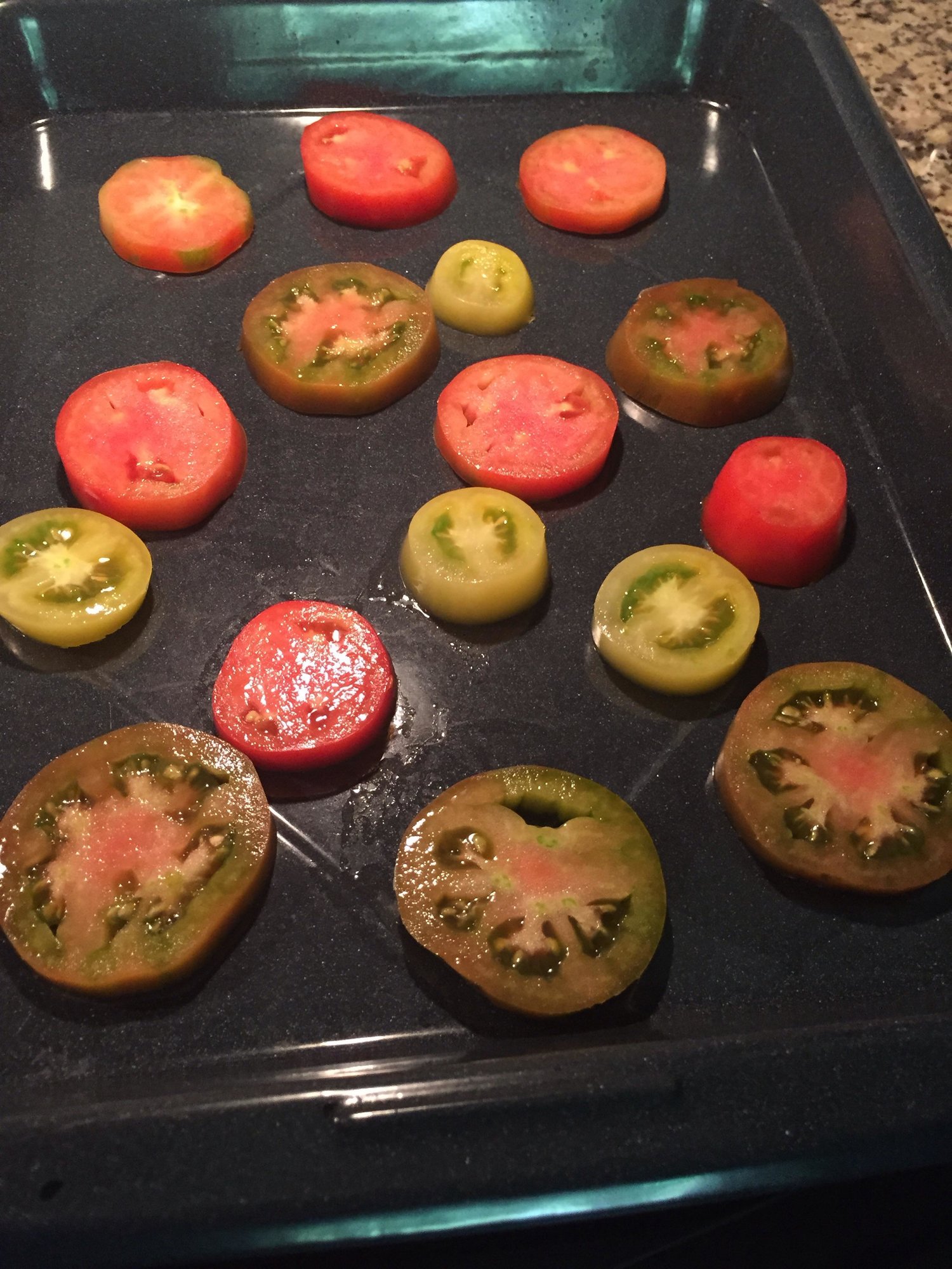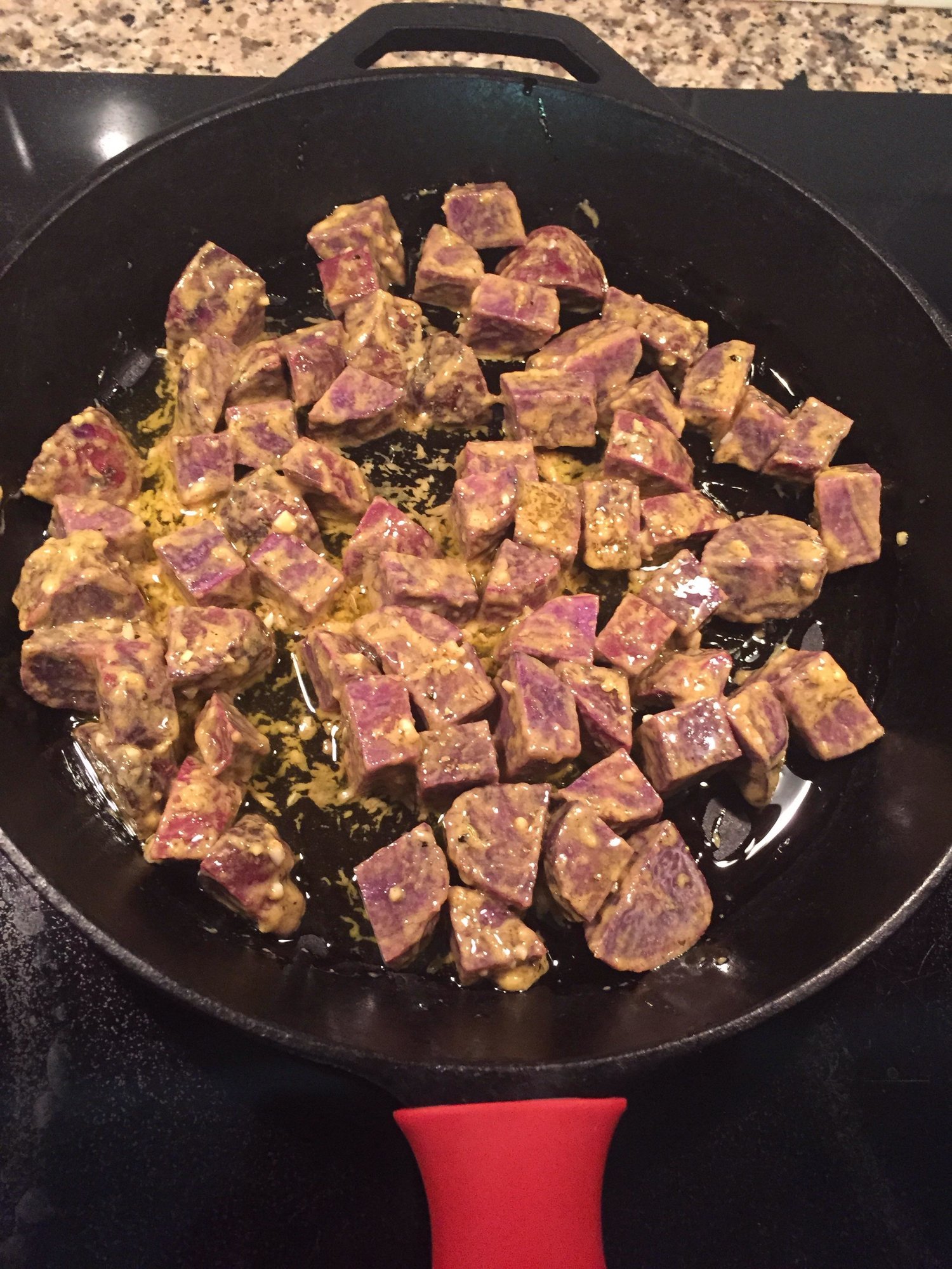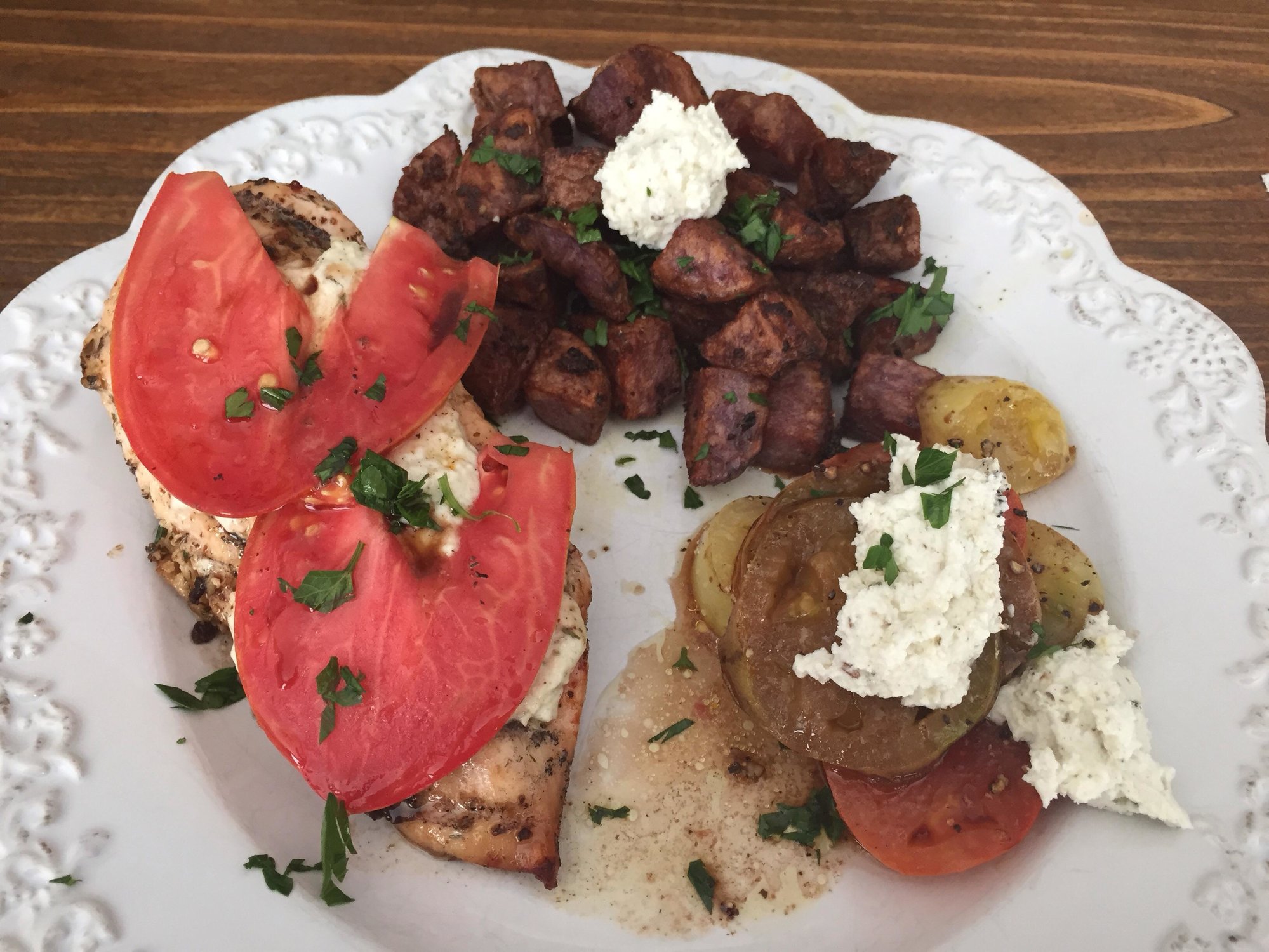 Checked out a farmers market this morning and grabbed some purple potatoes, heirloom tomatoes and Greek-inspired goat cheese, so decided to throw it all together with some chicken breasts.
