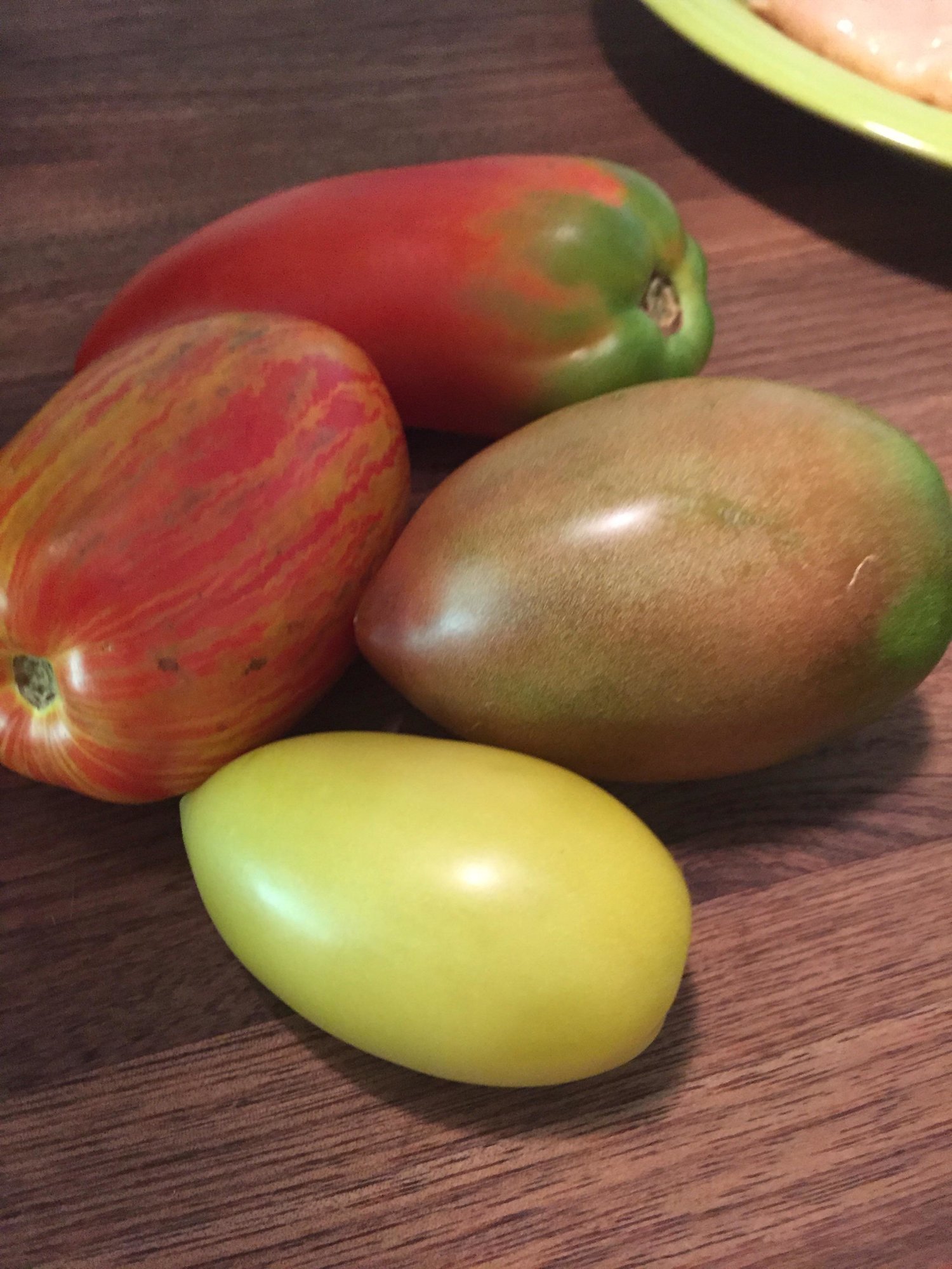 Bruschetta chicken with purple potatoes and heirloom tomatoes