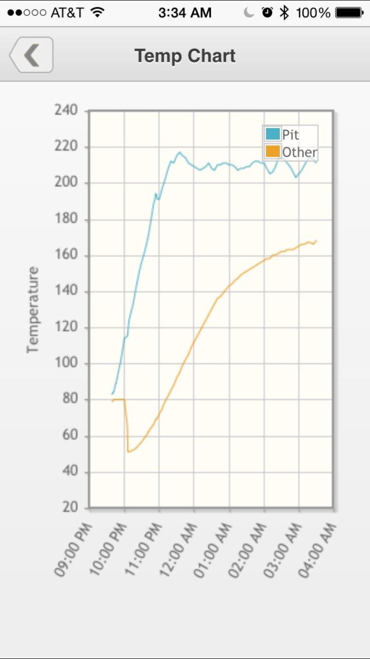 Regarding the cook... Before the Egg got to 190 I changed the set point to 210. It's now at 213. Here's my temp chart: