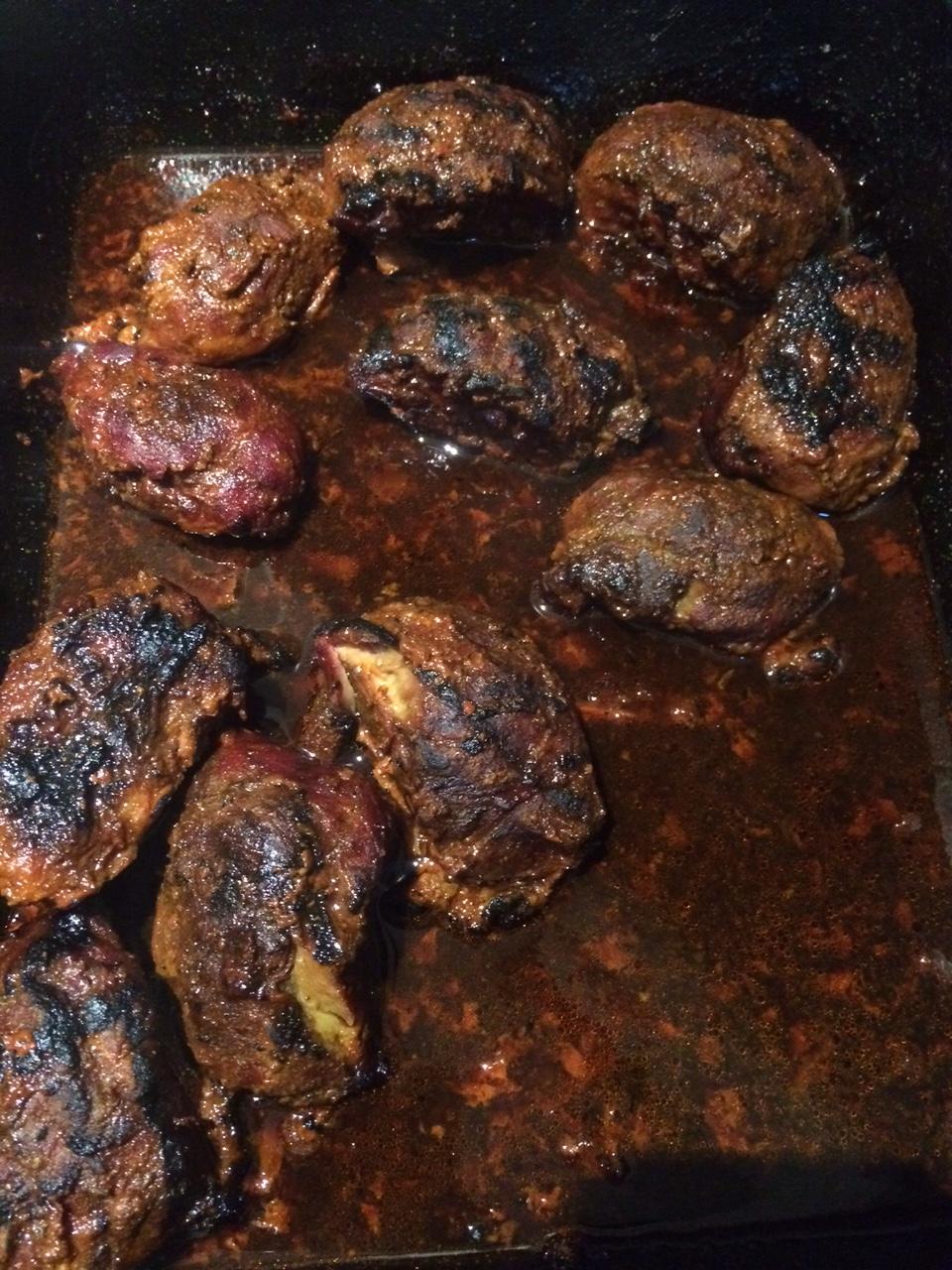 I then put the plate setter in and cooked them in a tray for 2 hours at 160c/320f. I then dropped the temp to 125c/250f, poured some stock in to the tray and covered with foil. Another 2 hours, then foil off, and 30 mins back at 160c/320f basting every 10 minutes with the stock.