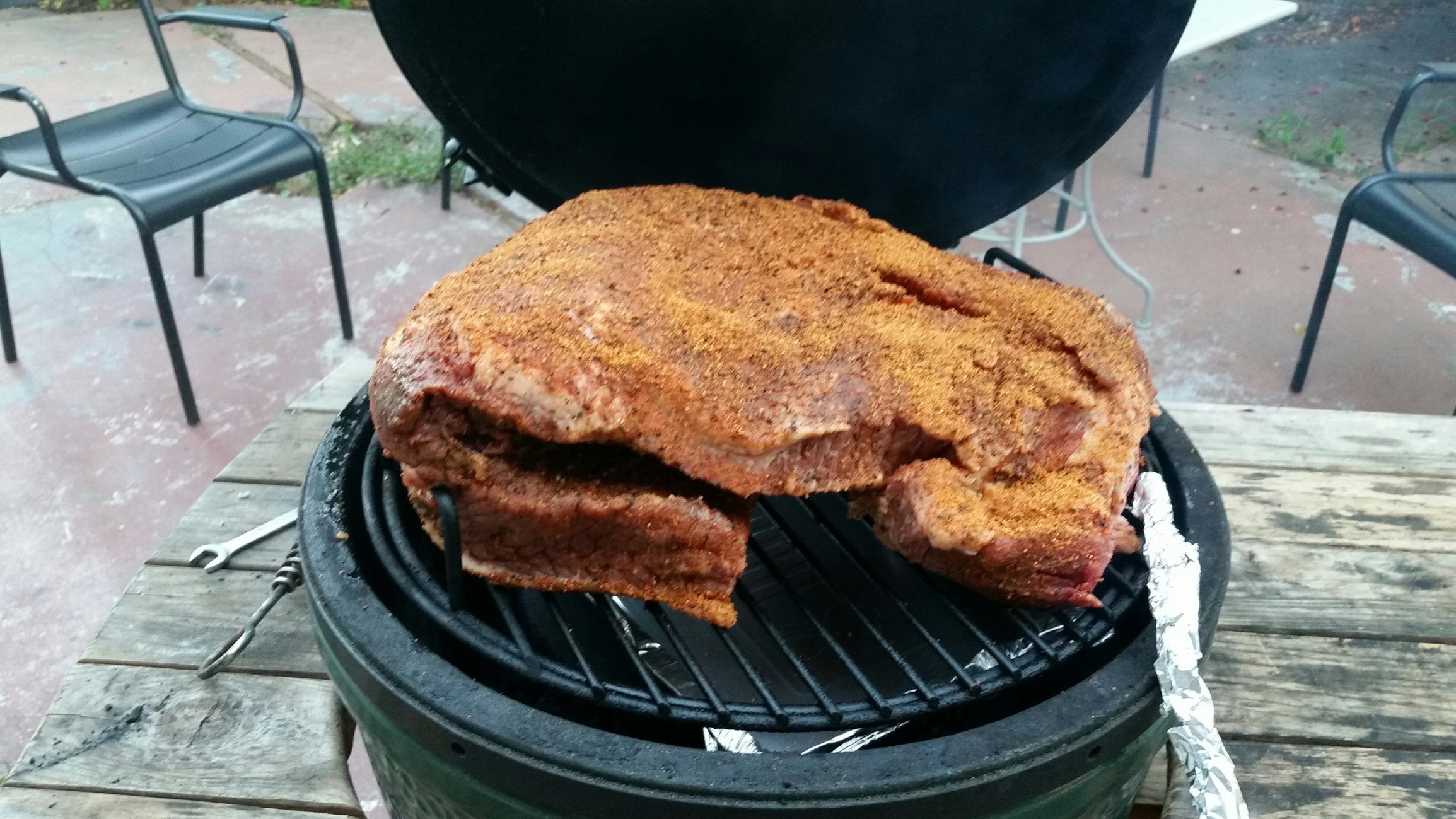 So as usual, I have crammed a 17 lb choice brisket on my medium egg, you know, because I can. The el foldo method, assisted with a skewer.