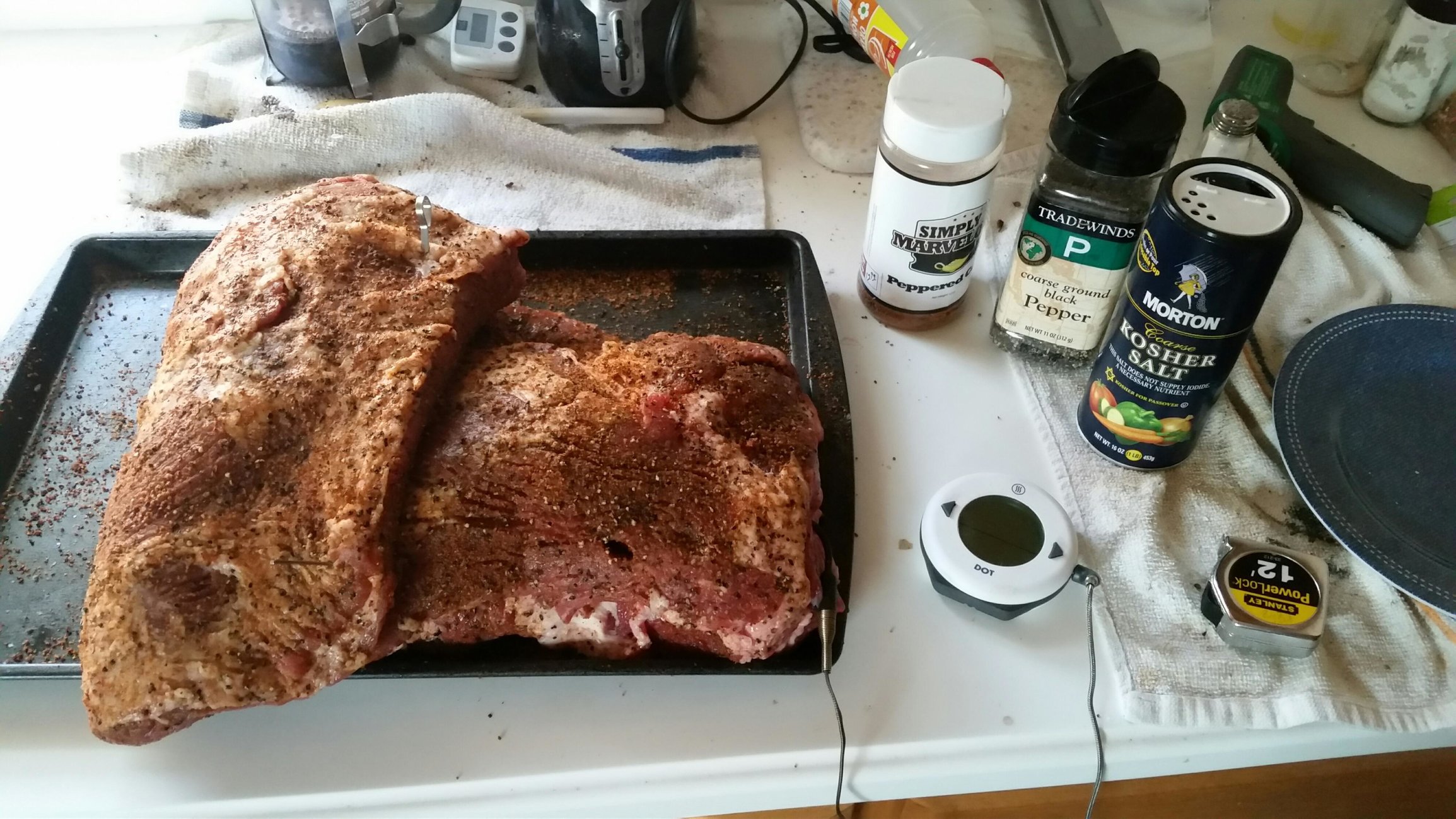 Trimmed a pound of fat at least, coated with Kosher salt, coarse pepper, and Peppered cow seasoning.
