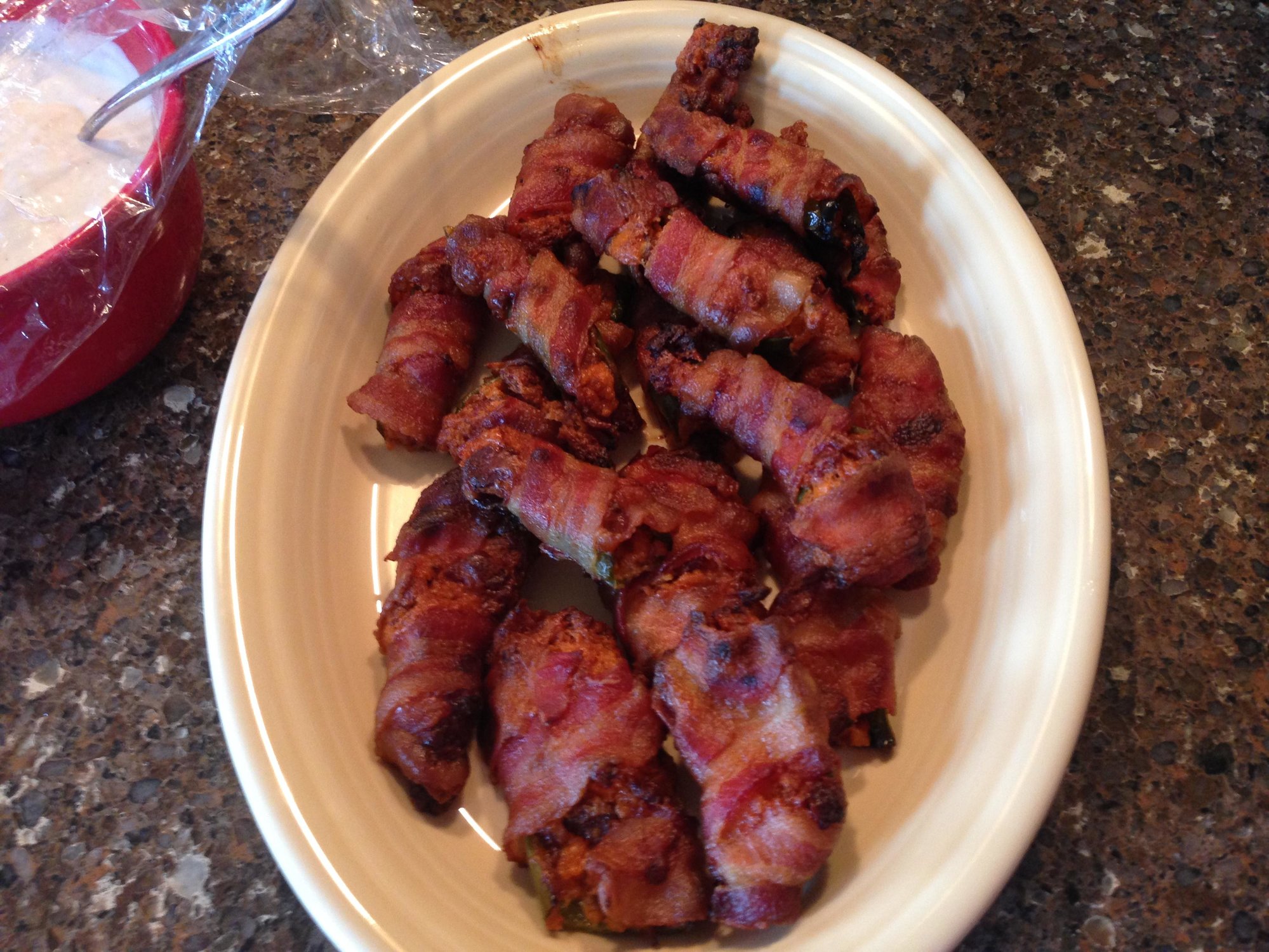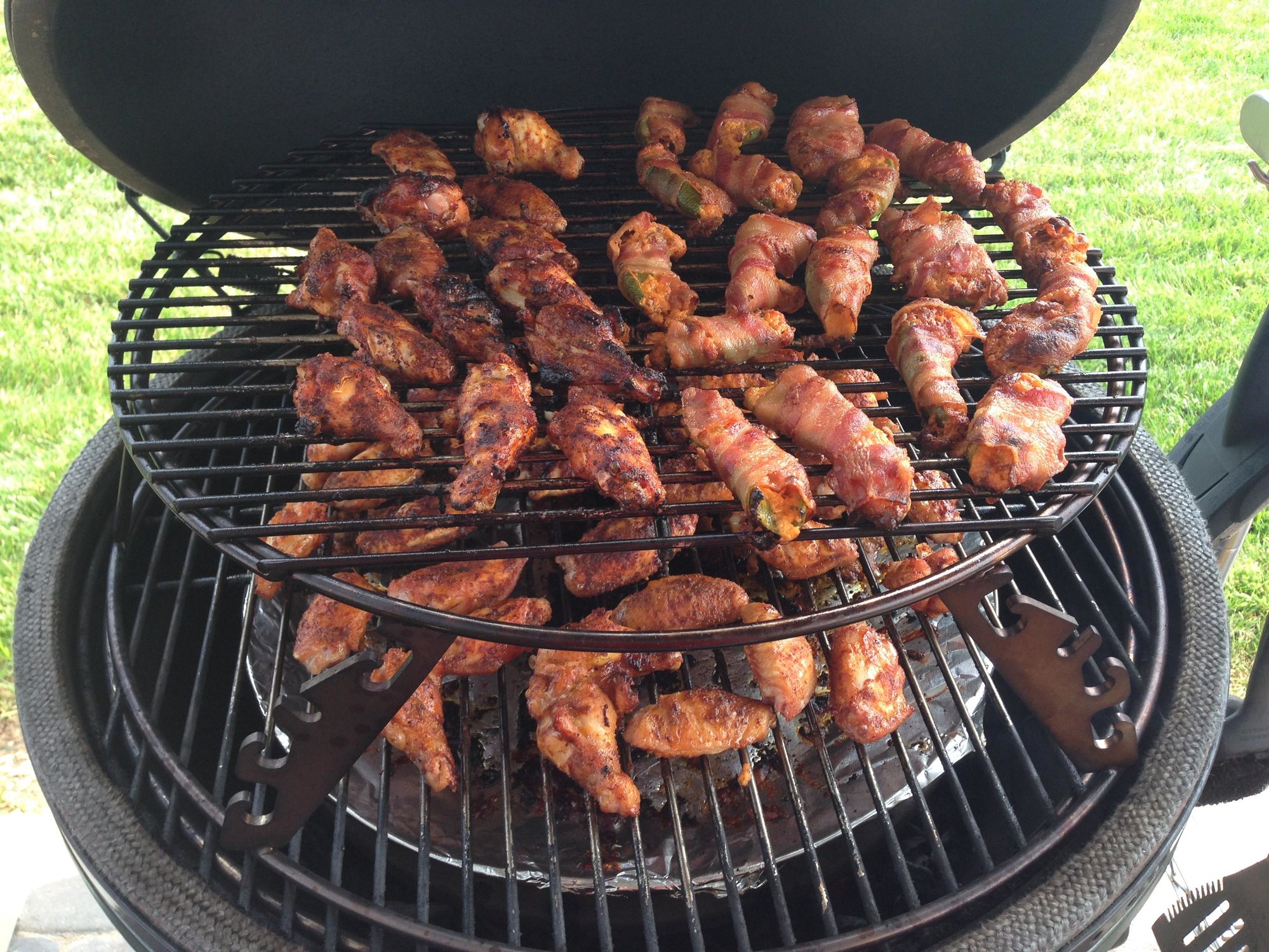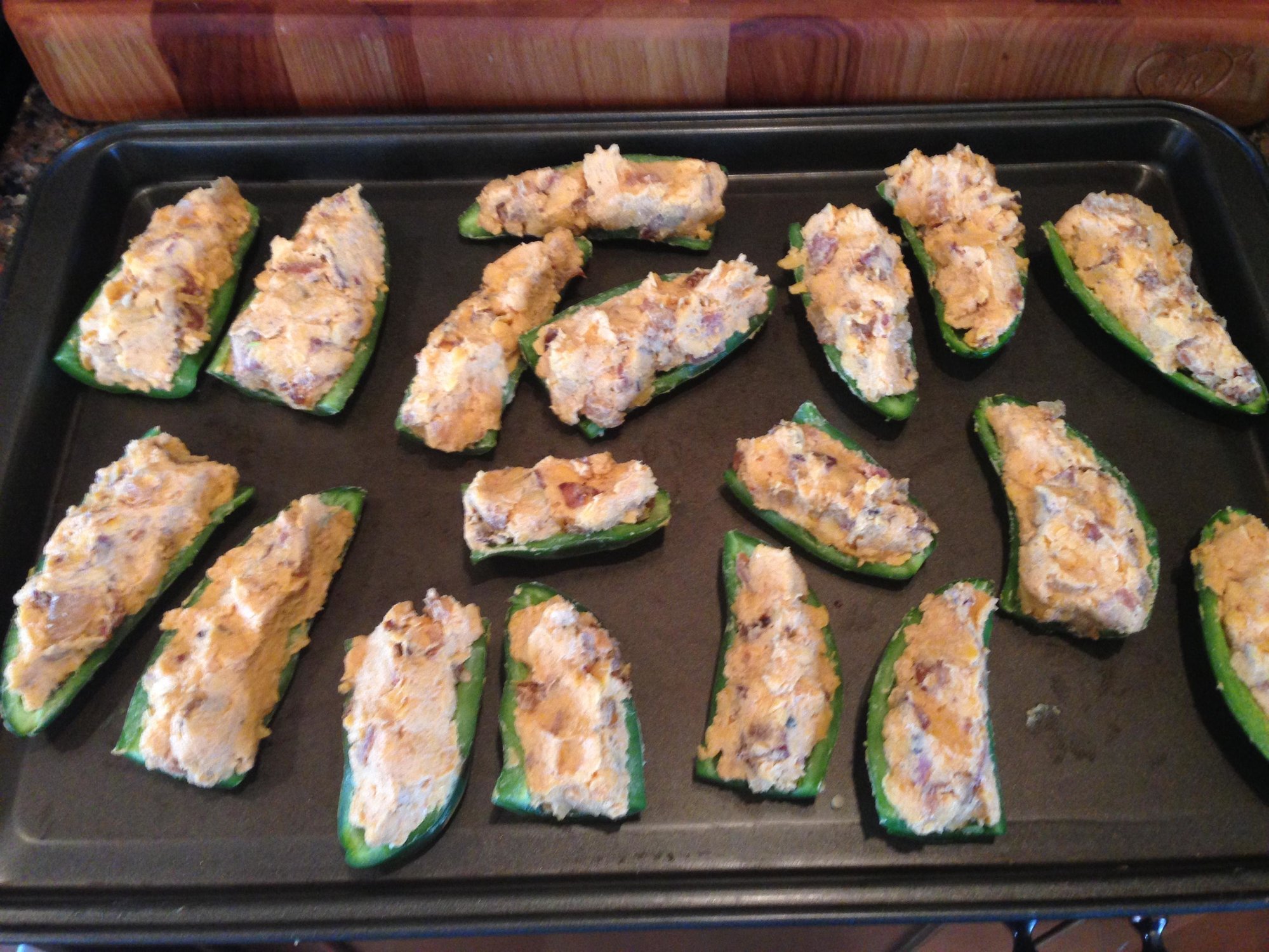 The wings were coated with Honey Hog, Honey Hog Hot, and Sugarfire BBQ rub. I did a test batch earlier in the week using the HH and HHH, they were good, but lacked some flavor. So this time I really coated them well and let them sit in the fridge for about an hour. They didn't lack flavor this time! Everyone said they were some of the best wings they've had. The ABTs were stuffed with a mixture of bacon, sauteed onions, and cheese blend; delicious as usual.