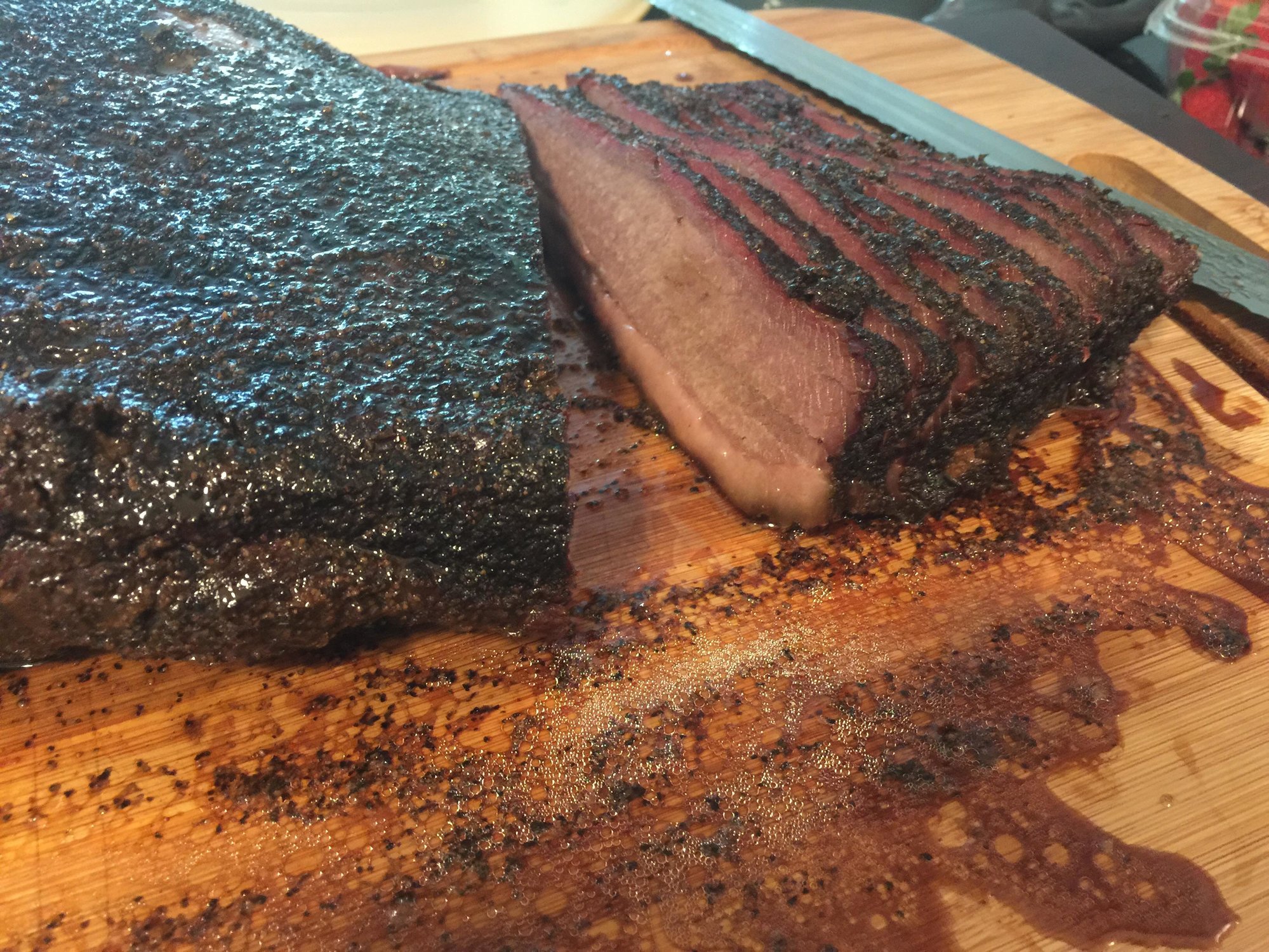 Started a nice SRF 14# brisket last night and pulled it 15 hours later at an internal temp around 190.  Wrapped and kept warm in the oven for 4 hours and sliced for tonight's dinner.