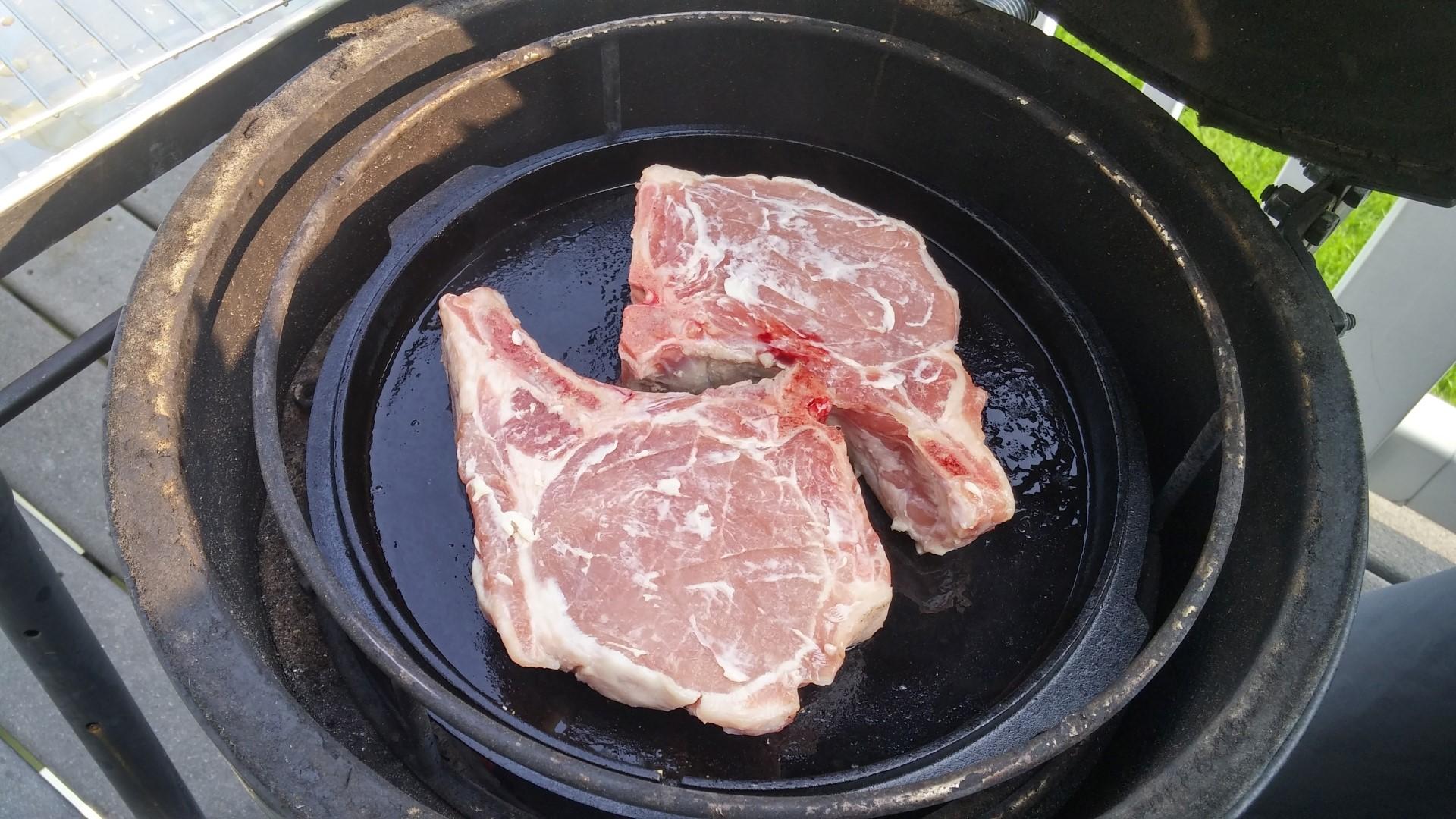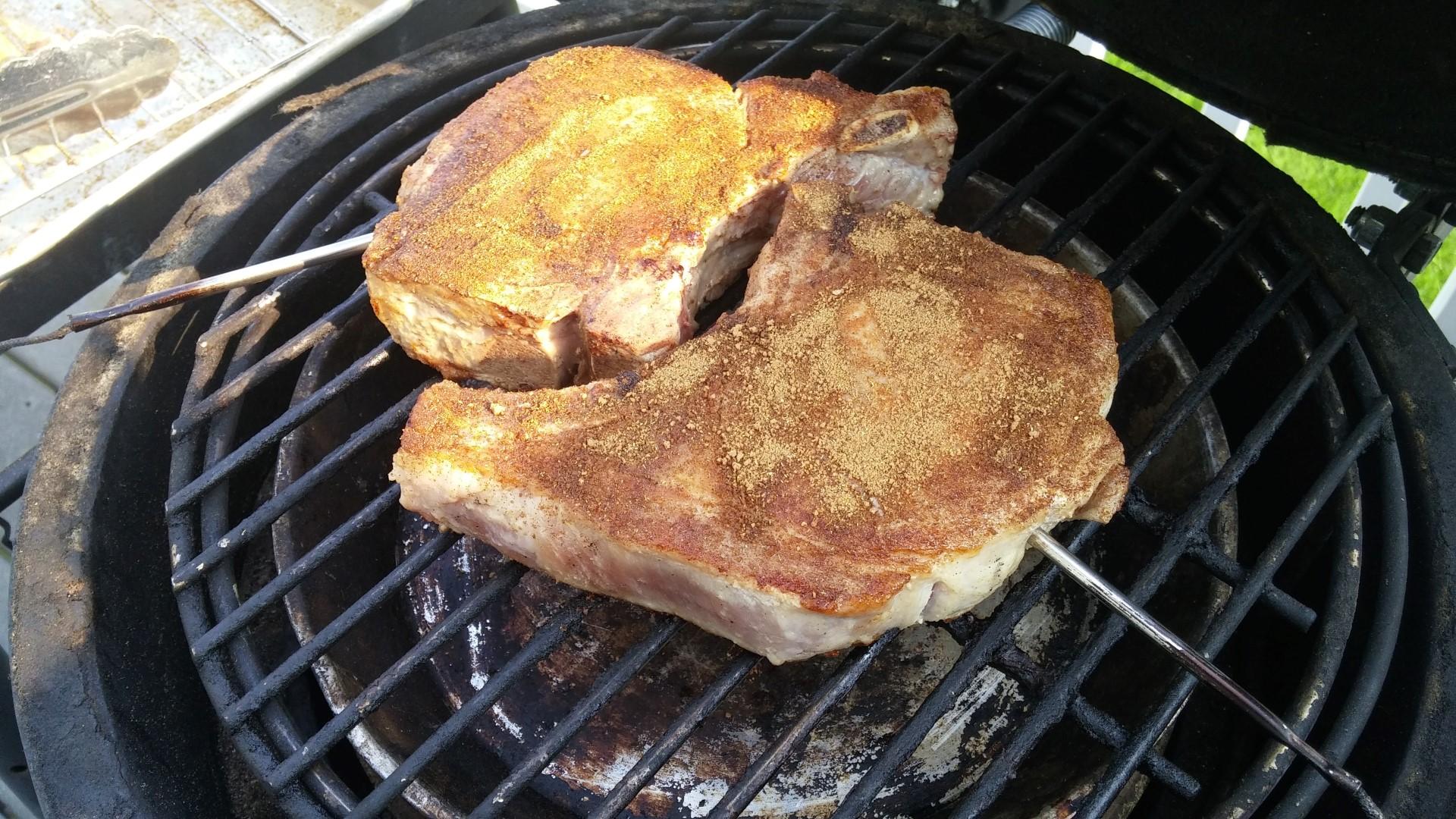 Once I had a nice brown on both sides I pulled them off, I closed the vents down, pulled out the CI, and put a cold stone in with drip pan. Rubbed the chops with a rub I made of Chinese 5 spice powder, brown sugar, cumin, white pepper, and a bit of cayenne. Back on to roast around 275*-ish.