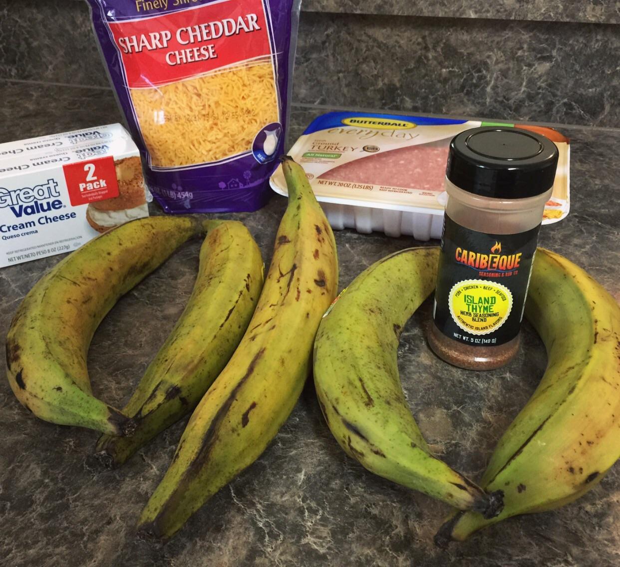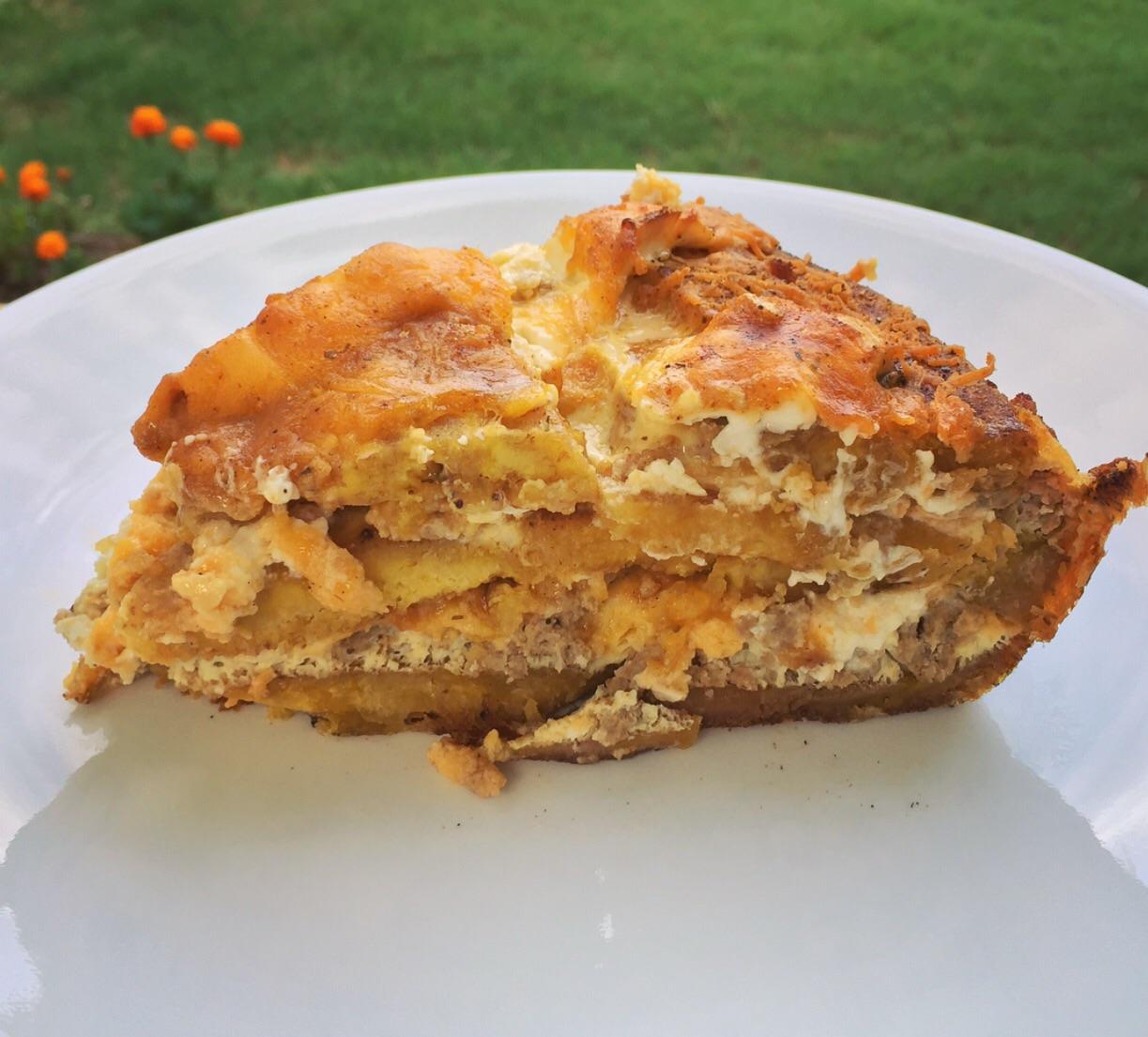 Basically it is like a Carribean lasagna. Started with a layer of length-sliced fried ripened plantains, then some Caribeque Island Thyme seasoned Ground Beef (I used lean Ground Turkey), thinly sliced globs of Cream Cheese, raw Eggs and Shredded Cheese. Then repeat. Mine had 3 layers. You want to finish it with the cheese layer on top. Baked mine indirect at a dome temp of 350 deg f for about 45 minutes. The first 15 minutes I covered it in foil. Then for the last 30 minutes, I uncovered it and tossed it a couple Apple wood chips for a kiss of smoke.