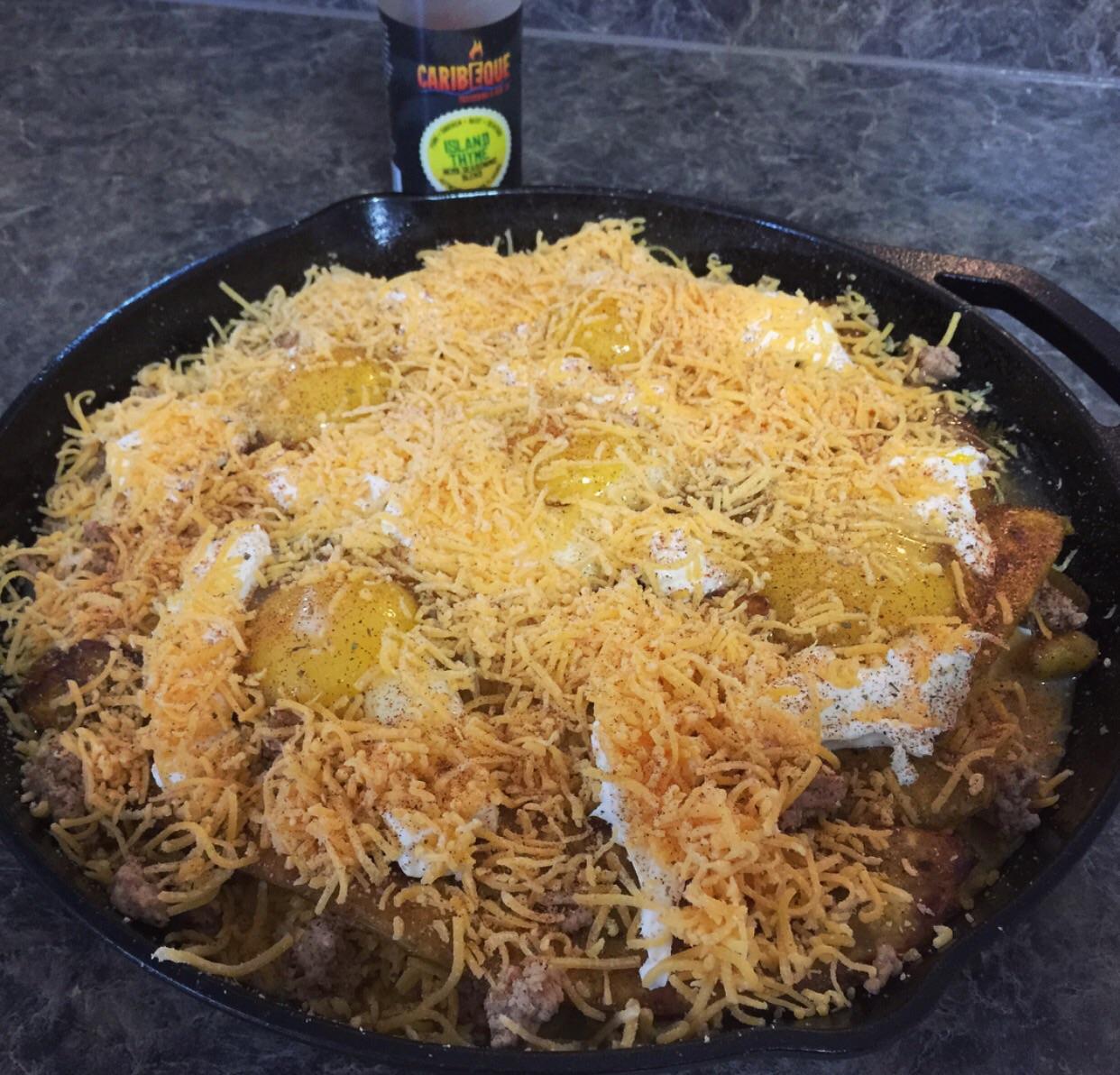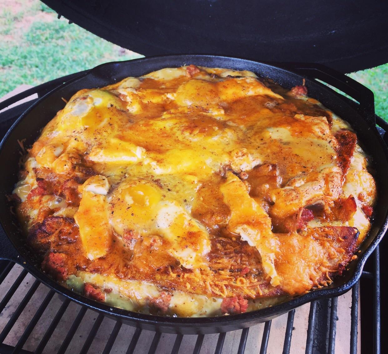 Basically it is like a Carribean lasagna. Started with a layer of length-sliced fried ripened plantains, then some Caribeque Island Thyme seasoned Ground Beef (I used lean Ground Turkey), thinly sliced globs of Cream Cheese, raw Eggs and Shredded Cheese. Then repeat. Mine had 3 layers. You want to finish it with the cheese layer on top. Baked mine indirect at a dome temp of 350 deg f for about 45 minutes. The first 15 minutes I covered it in foil. Then for the last 30 minutes, I uncovered it and tossed it a couple Apple wood chips for a kiss of smoke.Living The Big Green Egg Life...