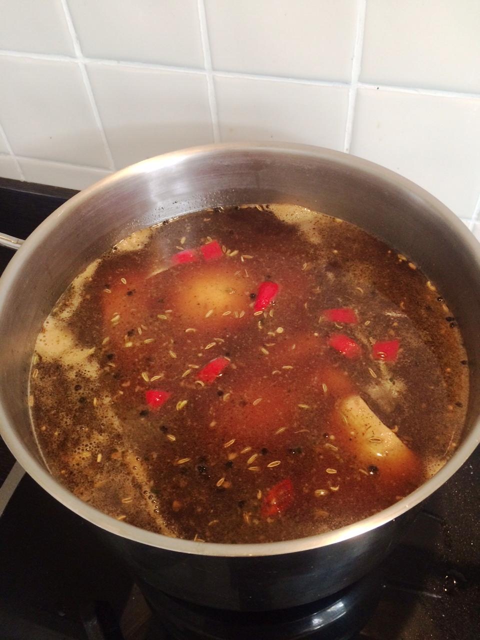 Braised in pork stock, blackstrap molasses, brown sugar, soy sauce, spices etc for 3 hours