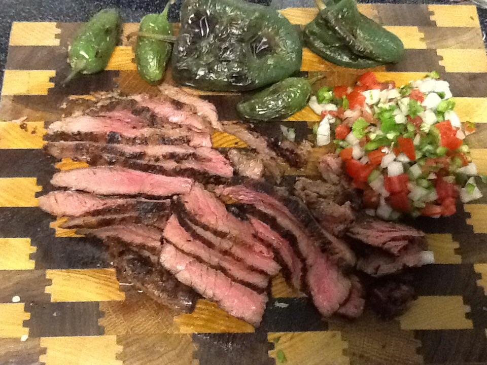 straight forward cook. Skirt steak seared at 600+ degrees served with homemade pico and roasted poblano and jalapeño peppers from the garden.