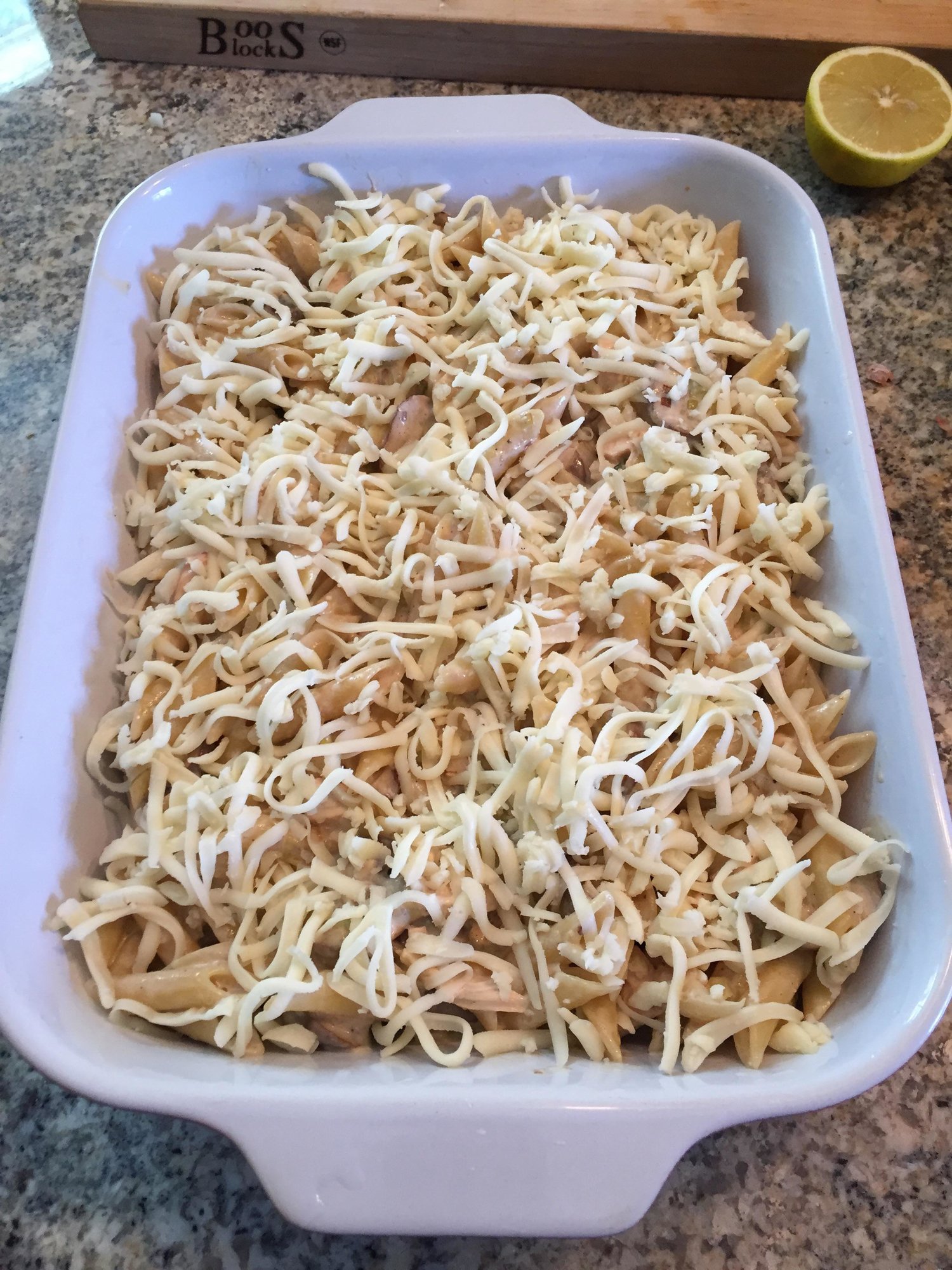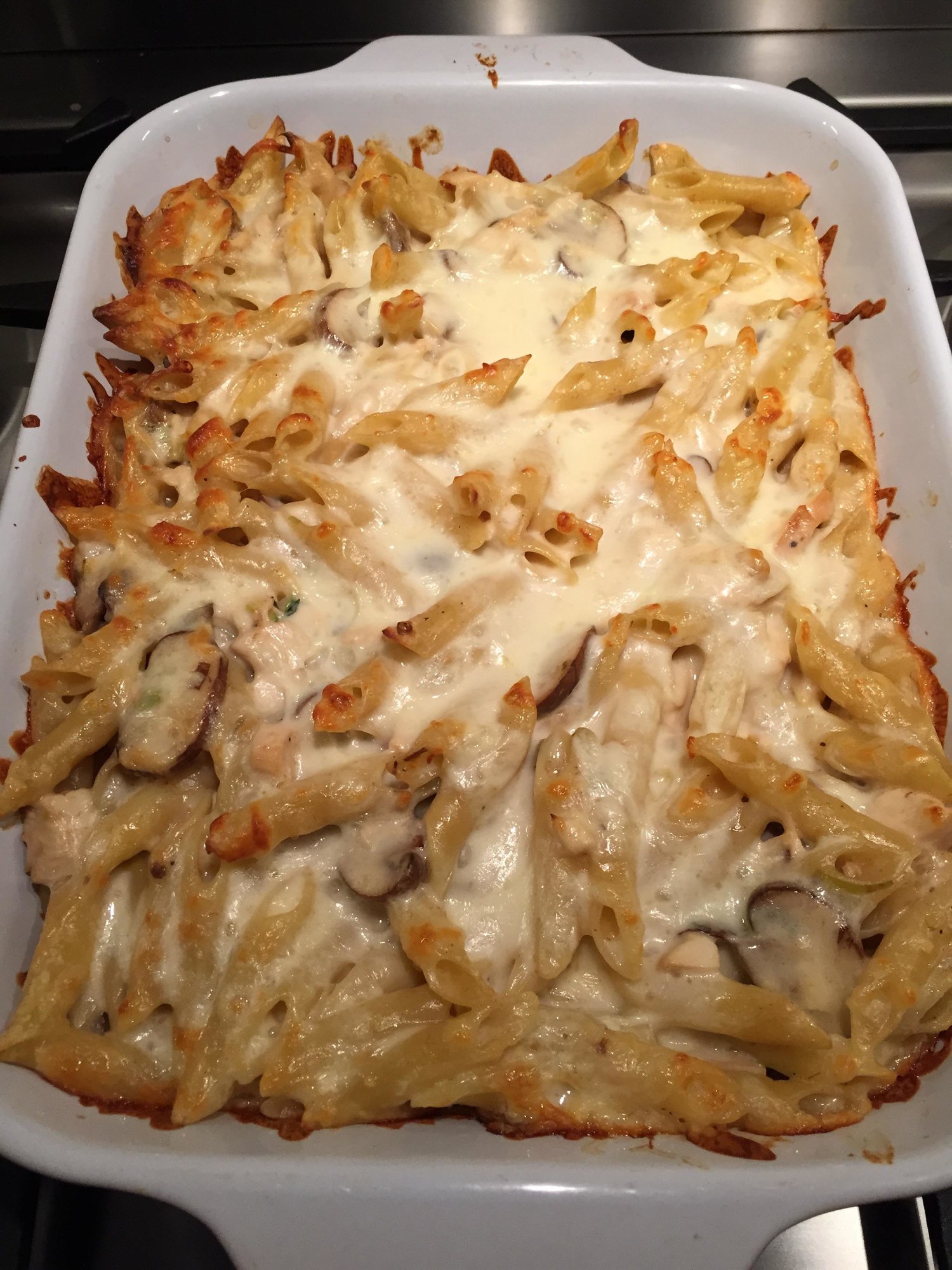 Baked pasta with a bit of smoky chicken. Sounds like good cooking to me.