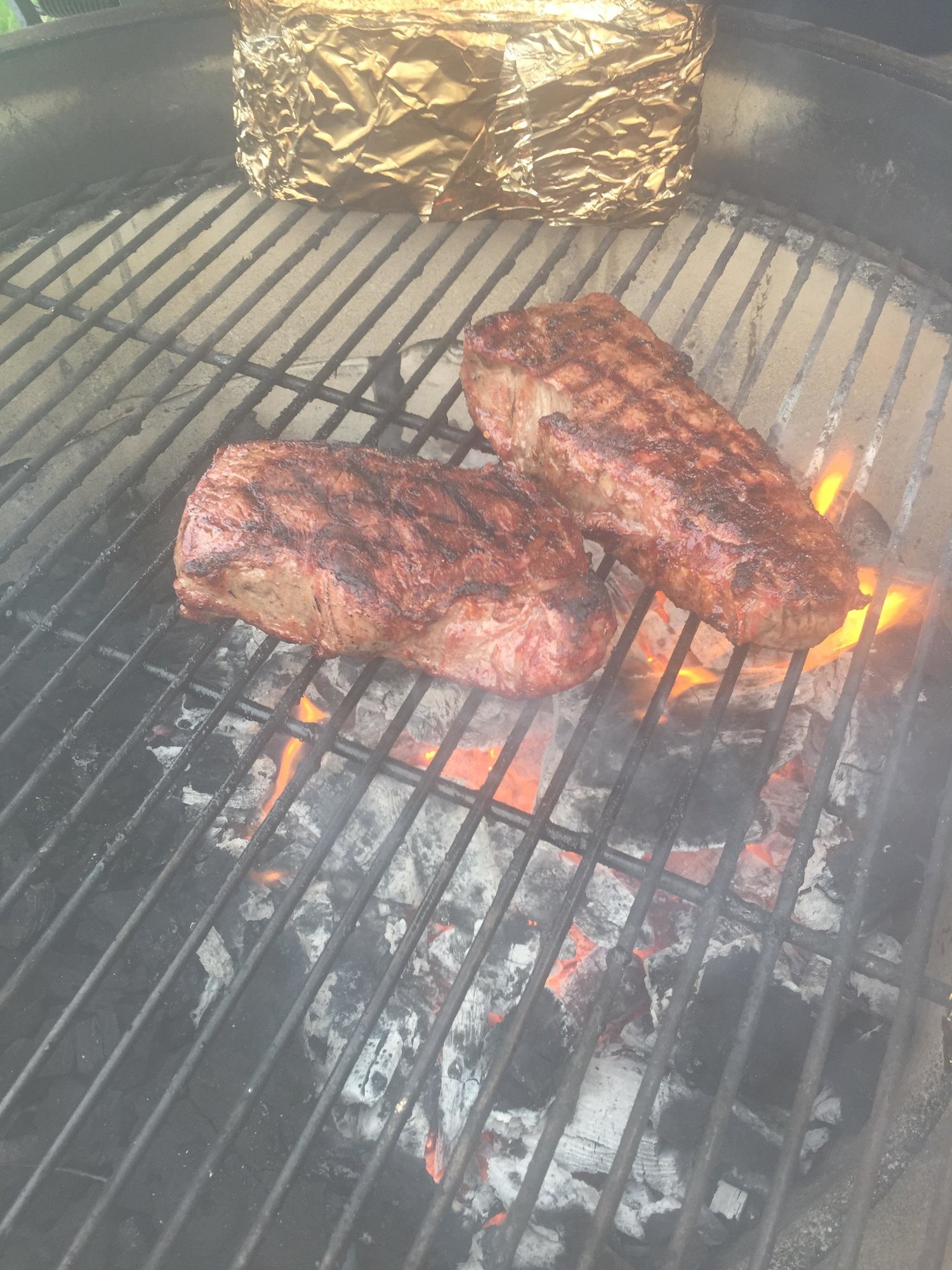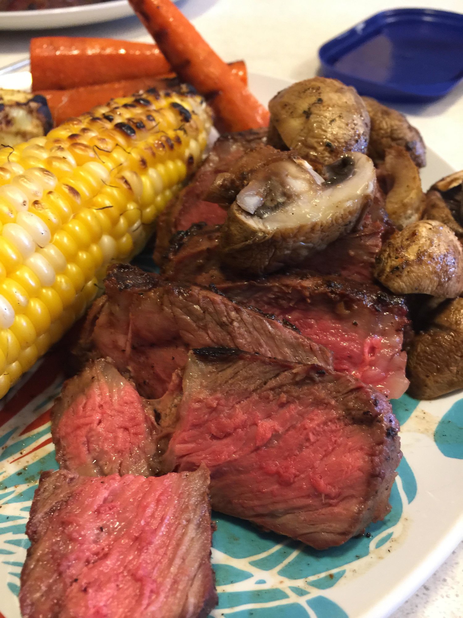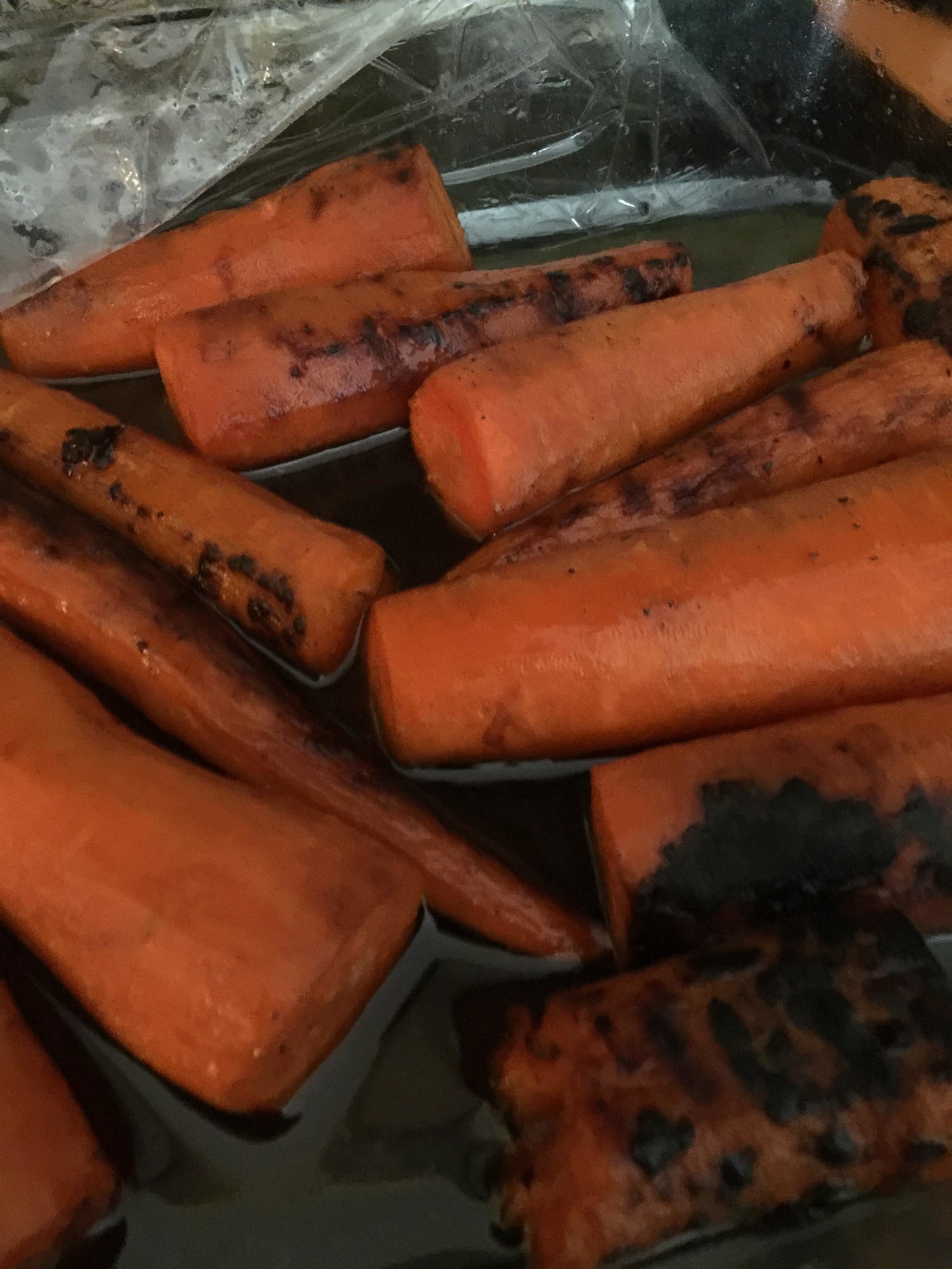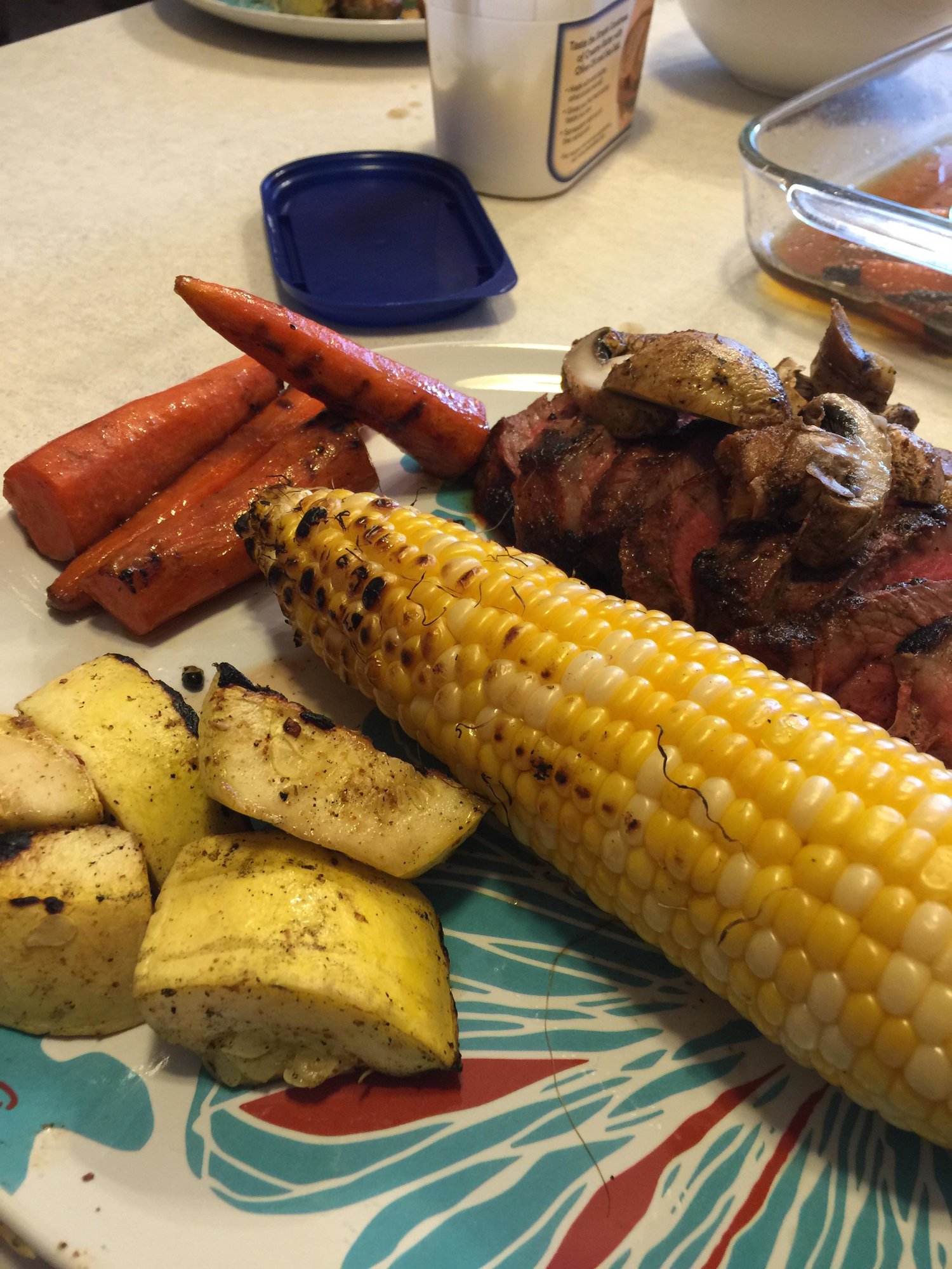 Decided tonight to try to make some glazed carrots mixed quarter cup of brown sugar quarter cup of EVOO, Rice wine vinegar a little ginger and a small amount of salt. Coated whole carrots and continue to brush them is a cook for about 20 minutes on the grill at 400° there on squash and corn at 400 then bump the grill up to 600 to cook steaks. Overall we were happy with the meal, carrots could have cooked a few min longer.
