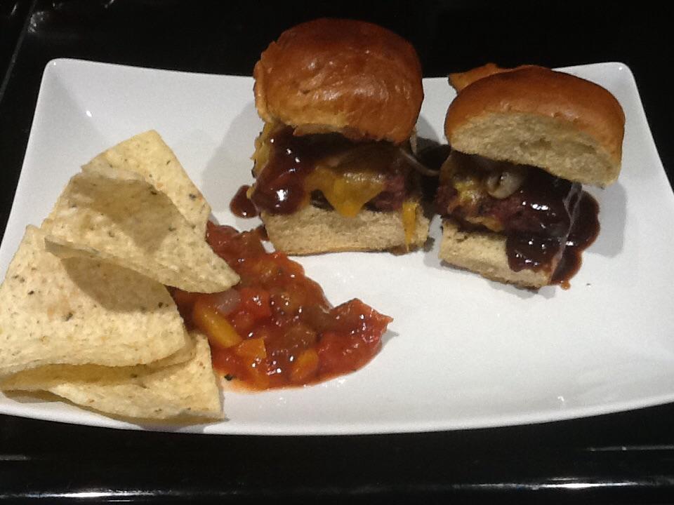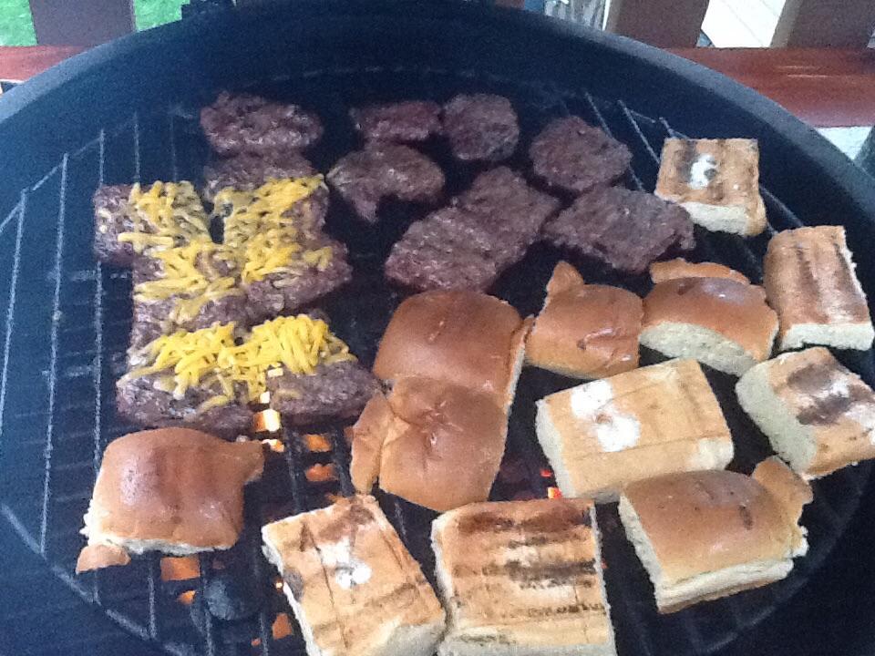 I was starving when I got home tonight. So I thought quick and sliders came to mind. Threw some onions in the CI, then grilled sliders toasted the rolls with butter and some Slap Ya Mama. Stacked on cheese, onions, pickle (the pickle makes it!) and some BBQ sauce. Ate em up with some mango peach salsa and chips. And now I'm hurting, but it was worth it.
