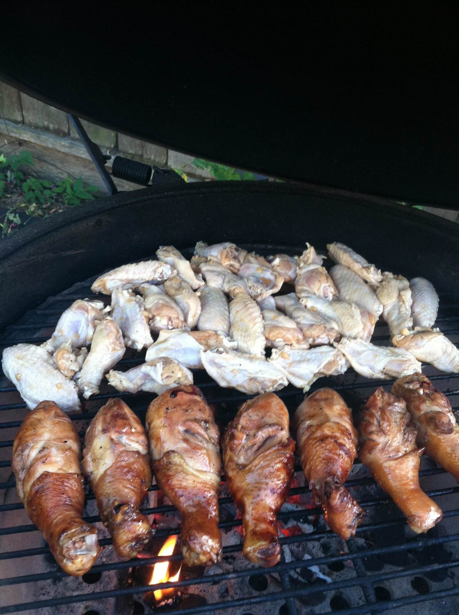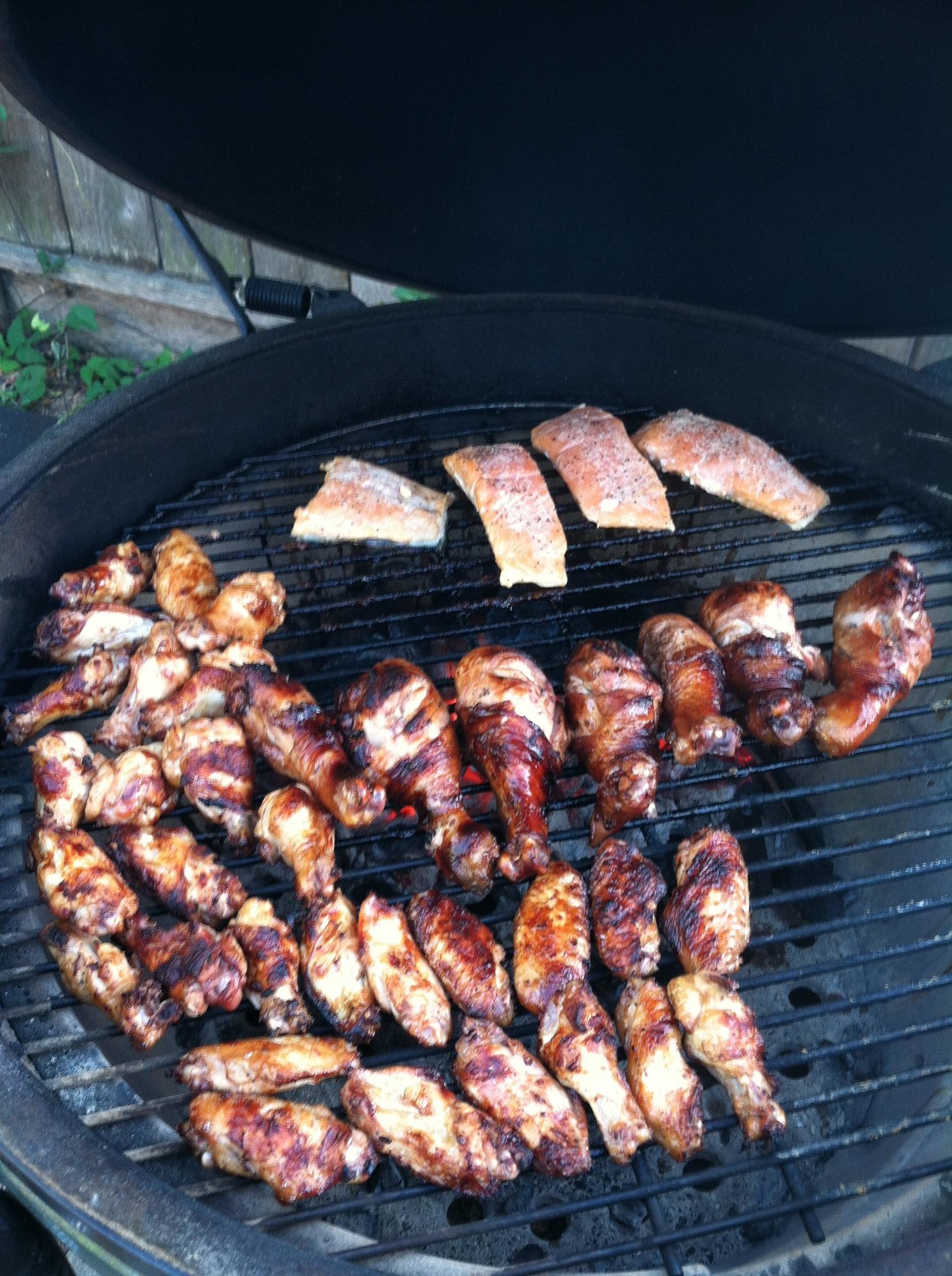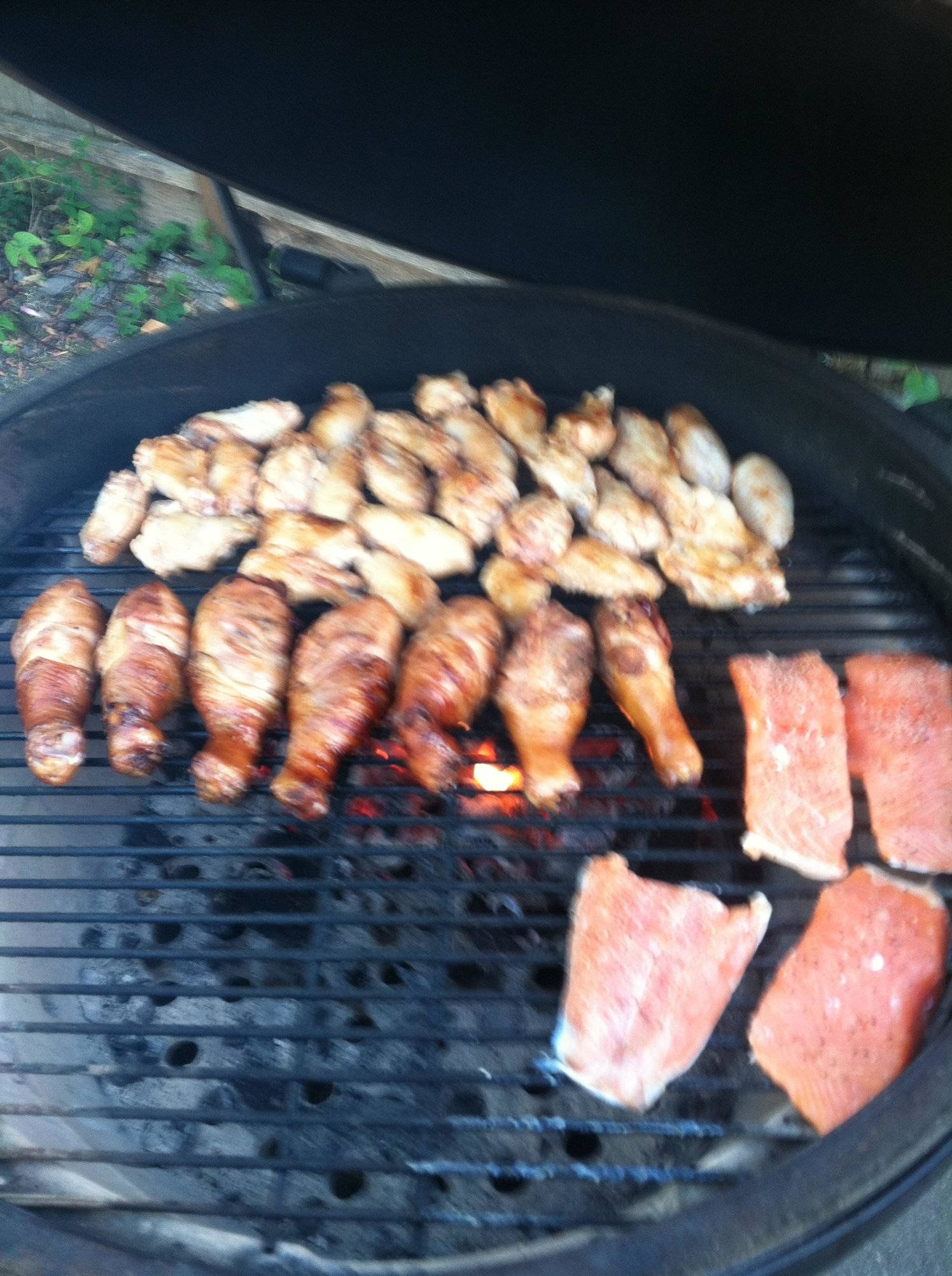 Parents and in-laws coming over to celebrate father in-laws birthday... Made some wings and drumsticks marinated in soy sauce and lemon, some salmon filet and tri-tip.