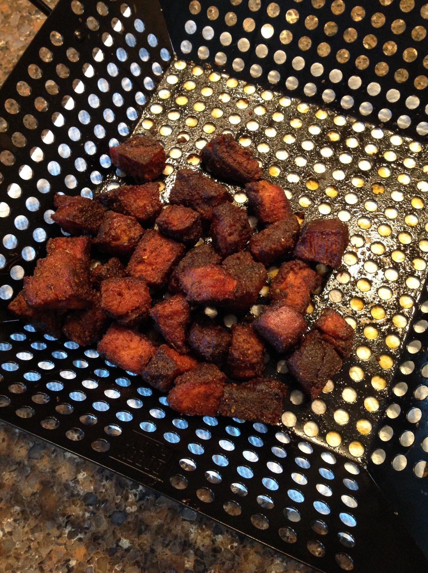 I took the pork steak off around 170, cubed, injected with a hot sauce and butter mixture, and recoated with rub. I put them back on for about another hour and a half. Taste tested a few and they were AWESOME. Might be one of my favorite things I have made yet. These were so simple and had such great flavor, hard to beat, I could eat wayyy to many of these. Thanks to @SGH for bringing these to light!