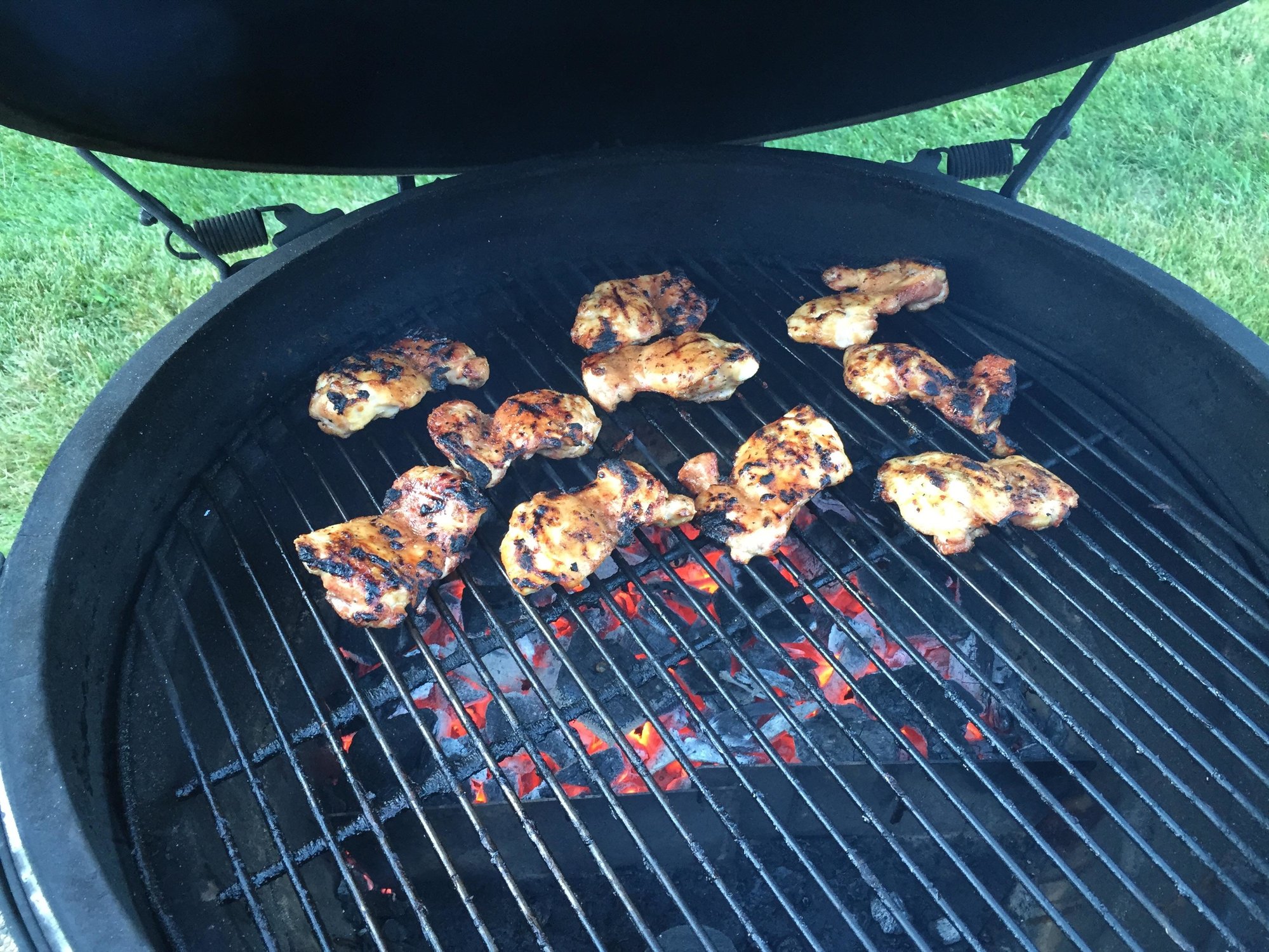 Boneless skinless chicken thighs smoked until 120/130 with cherry then direct until chared/yummy served with sweet potatoes and asparagus