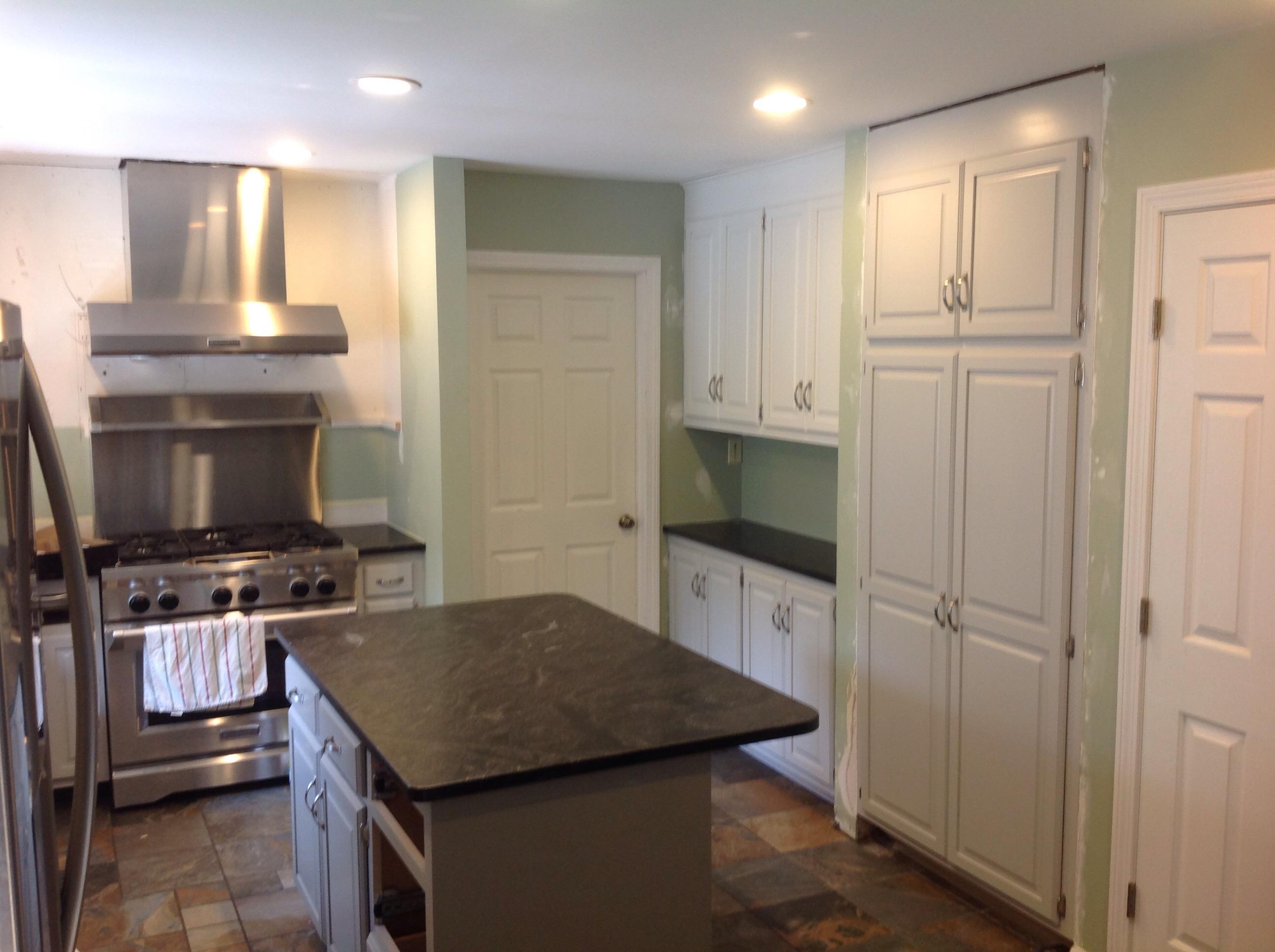 Cabinets have been professionally sprayed, and granite install just finished up. Now it's up to me to tile the backsplash and finish paint and trim.
