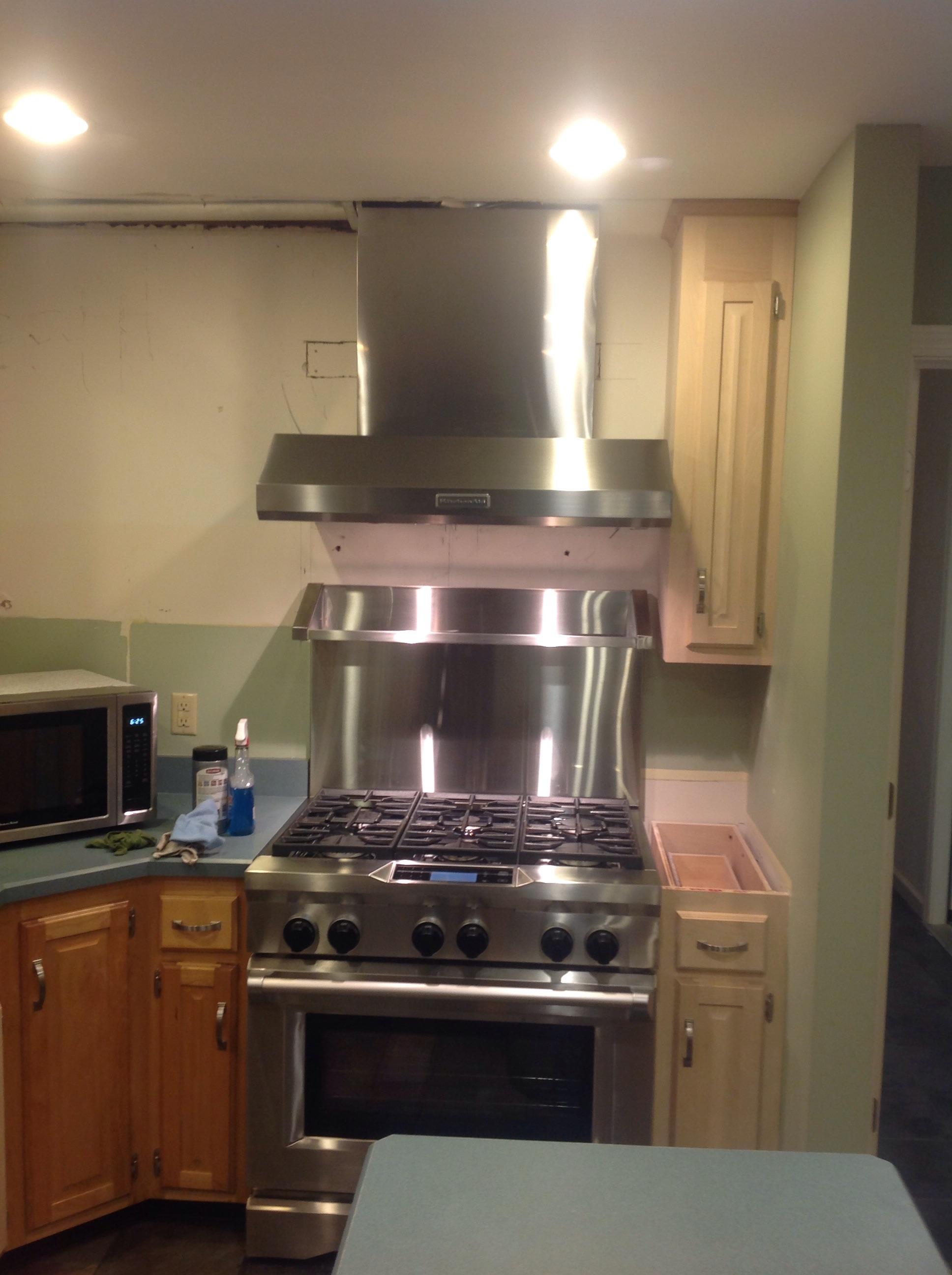 Finally got the new dual fuel range, ventilation hood, and backsplash installed today. Still need to put some stainless in the gap above the backsplash and put the cabinets back up to the left of the stove. Cabinets are getting refinished starting next week, and new granite goes in the first week of September. Can't wait for this remodel to be finished.
