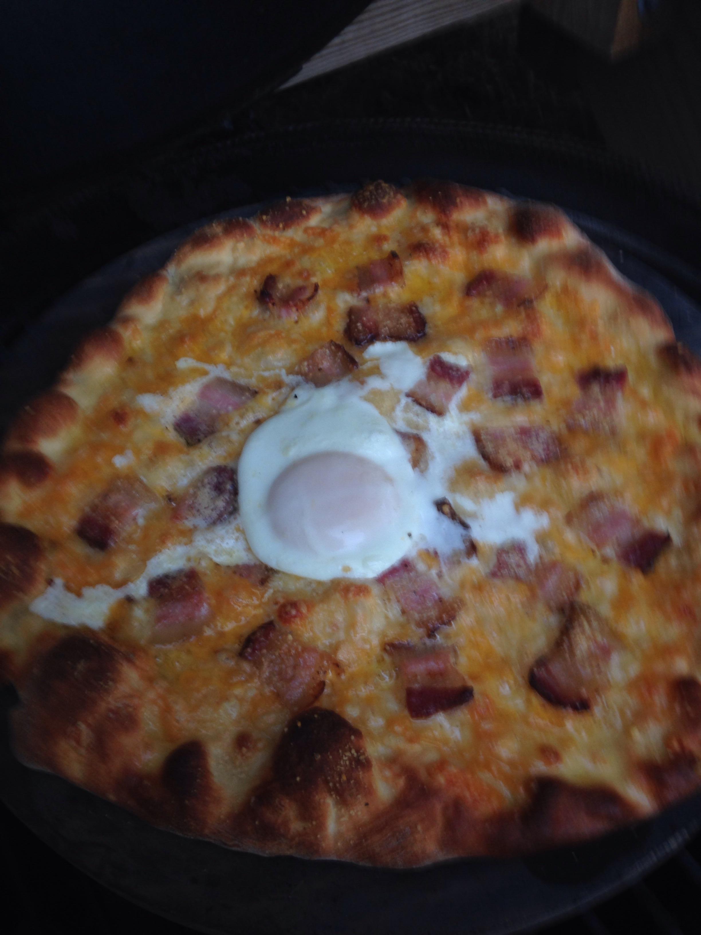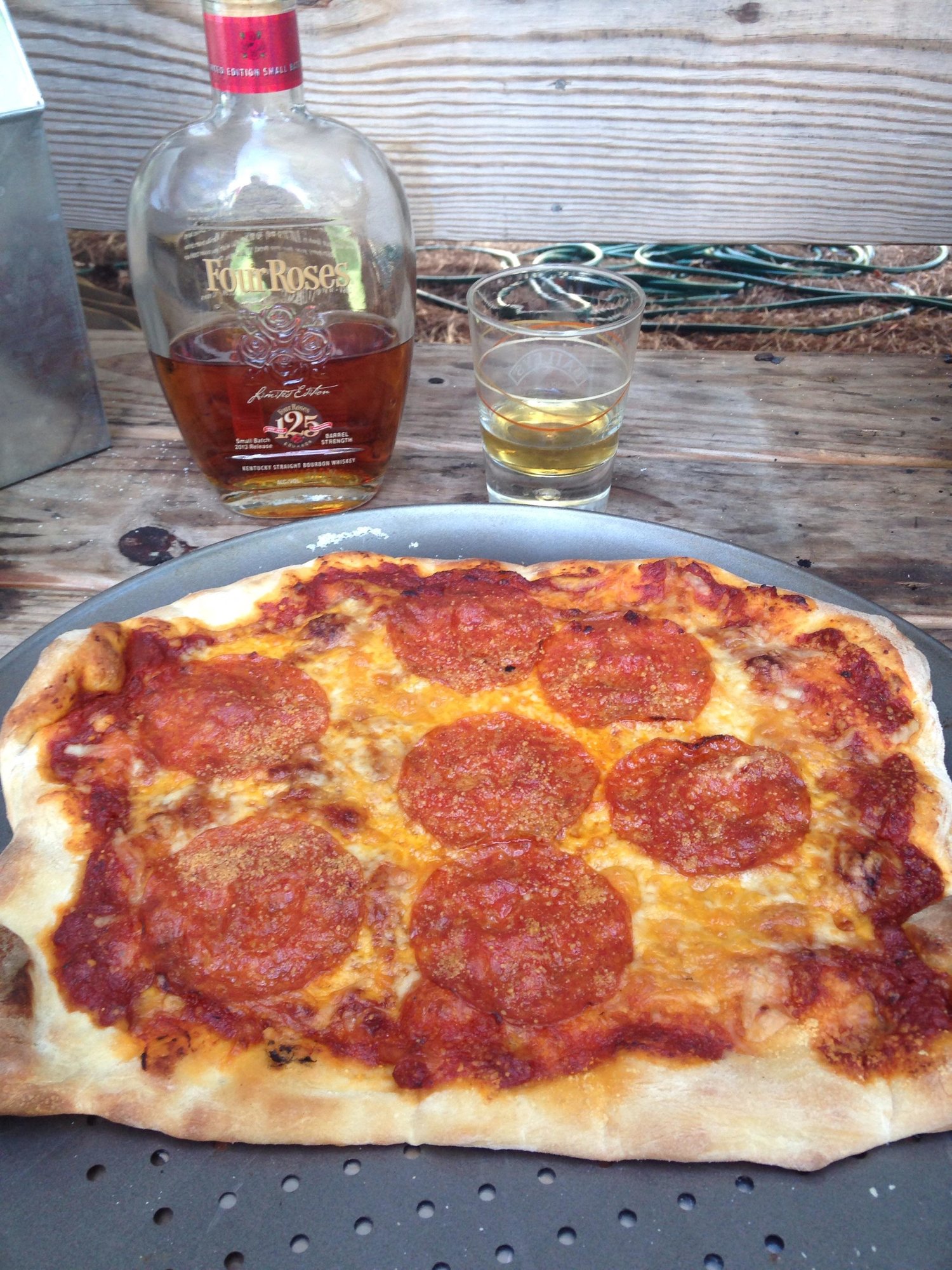 I went with pepperoni and homemade bacon and egg pizza, and a good bourbon on the rocks!