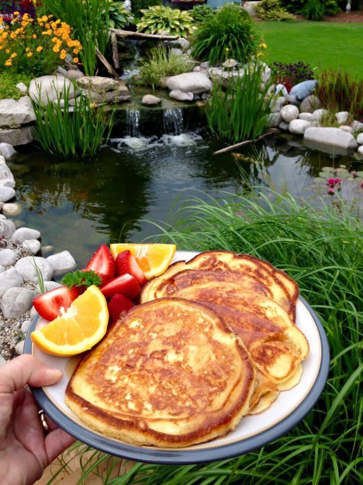 The pancakes are just perfect looking, and the yard with the relaxing water, wow. Way cool! Envious! -