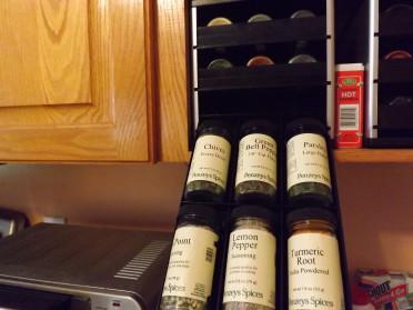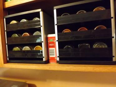 This set-up of two side by side will hold 36 bottles of spice and the rest that aren't used as much are in the pantry on a spice turntable. The trays pull out and tilt down for easy access. They make different sizes to fit most cabinets.