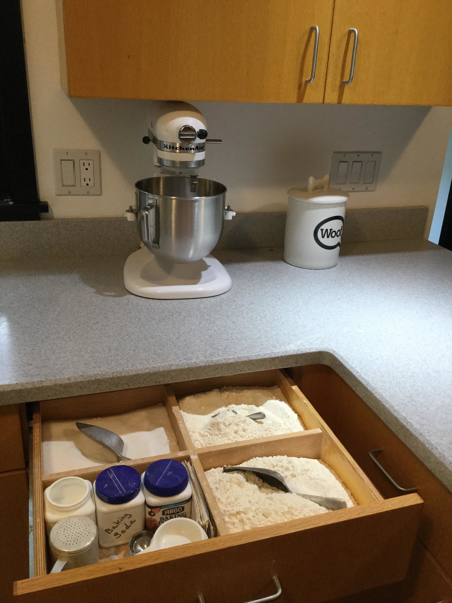 @cazzy, I neglected to show one of the drawer hacks. I bake almost every day and like POS (point of use storage). The sections hold #5 dry - sugar, ap & bread flour. I purchase #25 bags and store the overflow in Cambro.