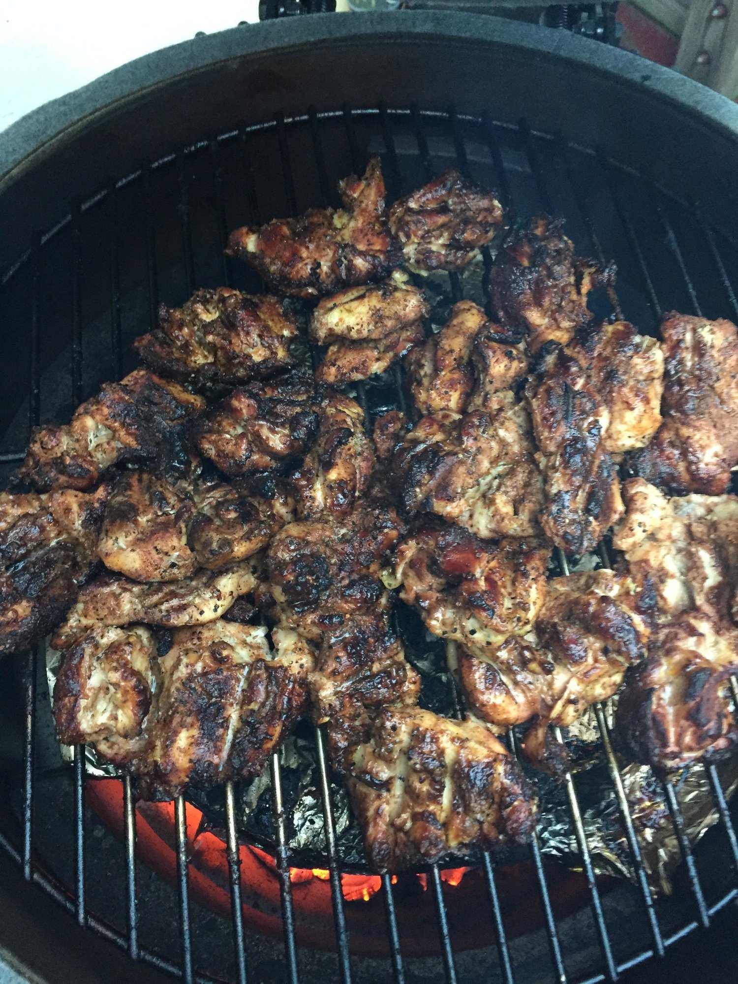 also tried to smoke some chicken thighs sunday night for pulled chicken. i was short on time so kept the temp pretty high. i think i had it too hot and cooked too long as i dried them out which is a feat in itself for chicken thighs. here they are after the first turn.