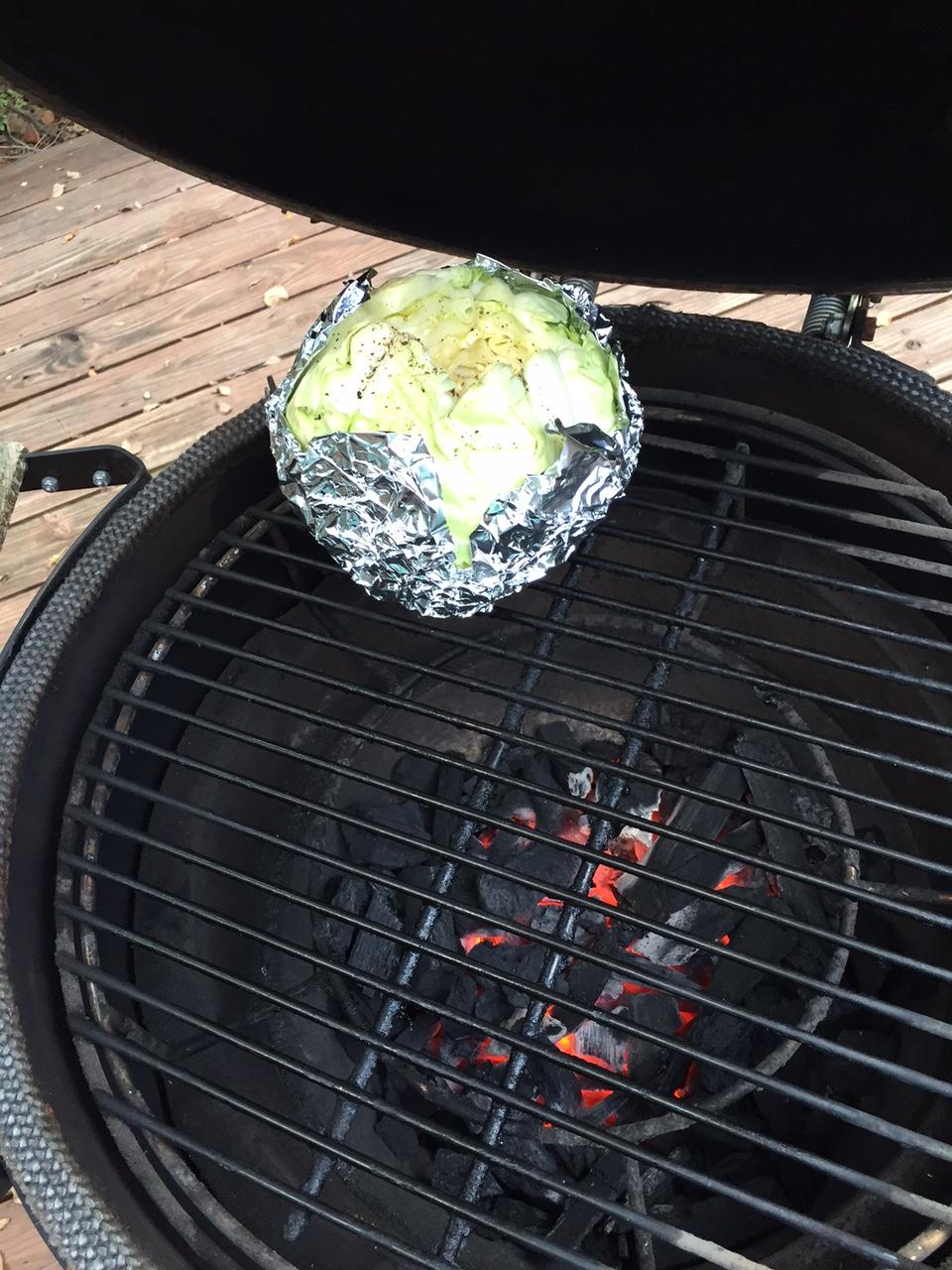 5. Wrap generously with foil and grill over indirect heat for approximately 1-1.5 hour. for slightly underdone cabbage, 1.5-2 hours for done.