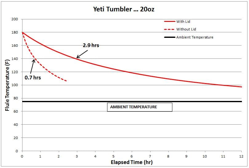 Fill the tumbler with hot water that is hotter than your start temp. Measure the water temp about three inches down from the surface. A Thermopen is great for this usage ... if you're a real nerd, then flip the #2 switch to measure to the nearest 0.1 degree. When it cools to your start temp, then start a stop watch. When it cools to your end temp, then stop the watch. No fancy curves, least squared analysis, nor curve smoothing, etc ... just measure the time it takes to cool down 40 degrees. Now, if you did it with the top off and your time is 0.7 hrs, then your tumbler is good! If you did it with the top on and your time is 2.9 hrs, then again your tumbler is good. If your times are shorter, then your tumbler has lost some efficiency.