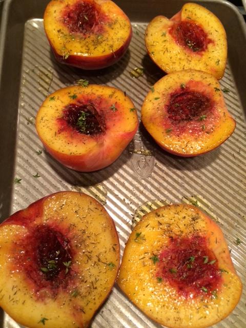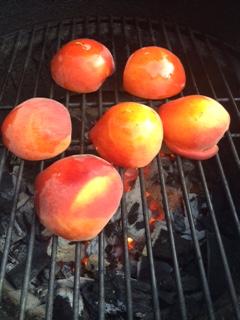While the chops were resting (about 5/7 minutes) I left the lid up and grilled the peaches. I placed them face down on the Egg for about 3 minutes, then rotated then 45 degrees for grille marks (which didn't really work). I then flipped them on their backs for about 2/3 minutes and pulled them.....about 6/7 minutes total.