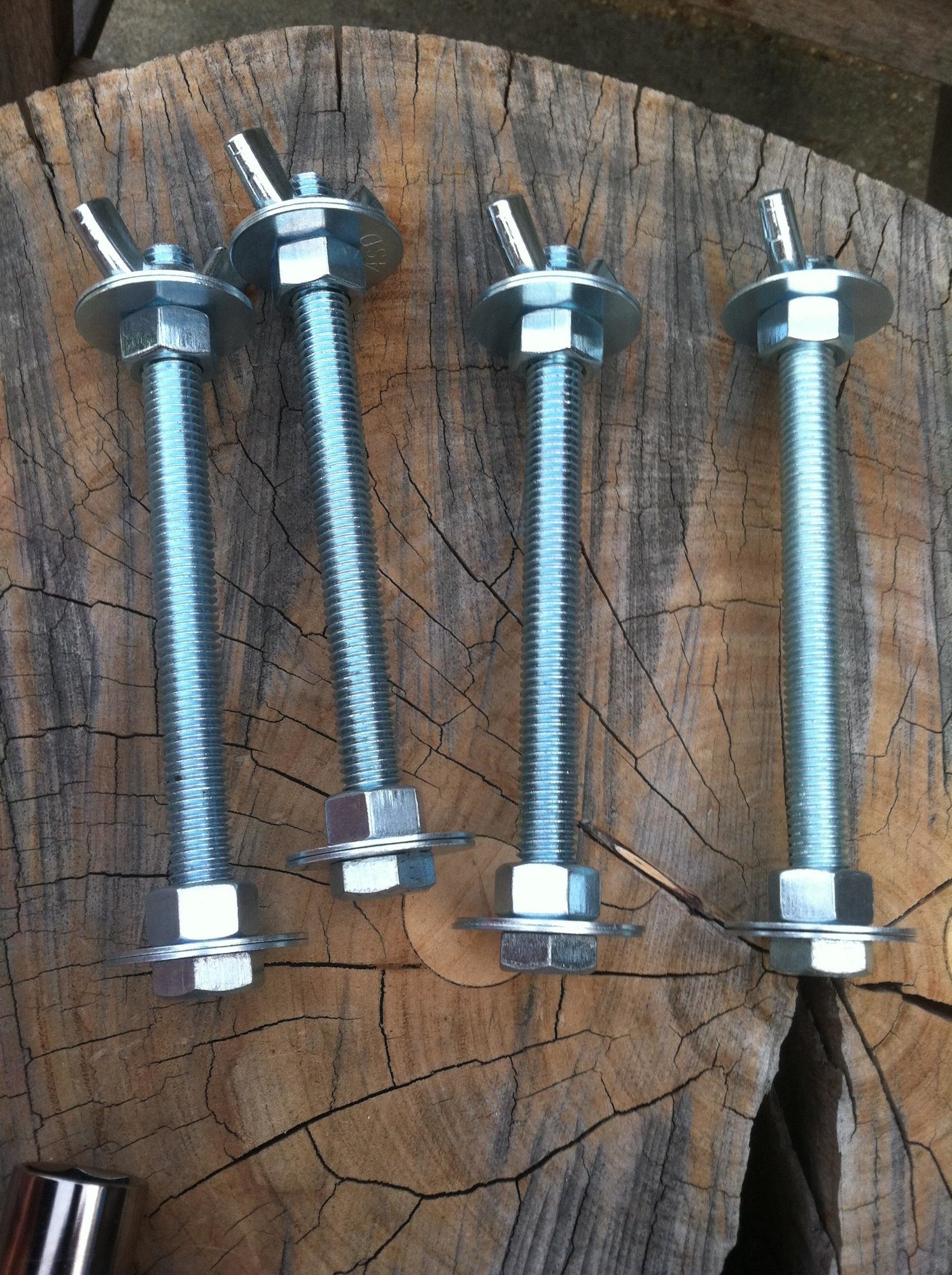 I bought 6" long 1/2" dia bolts with some fender washers, nuts and wing nuts.