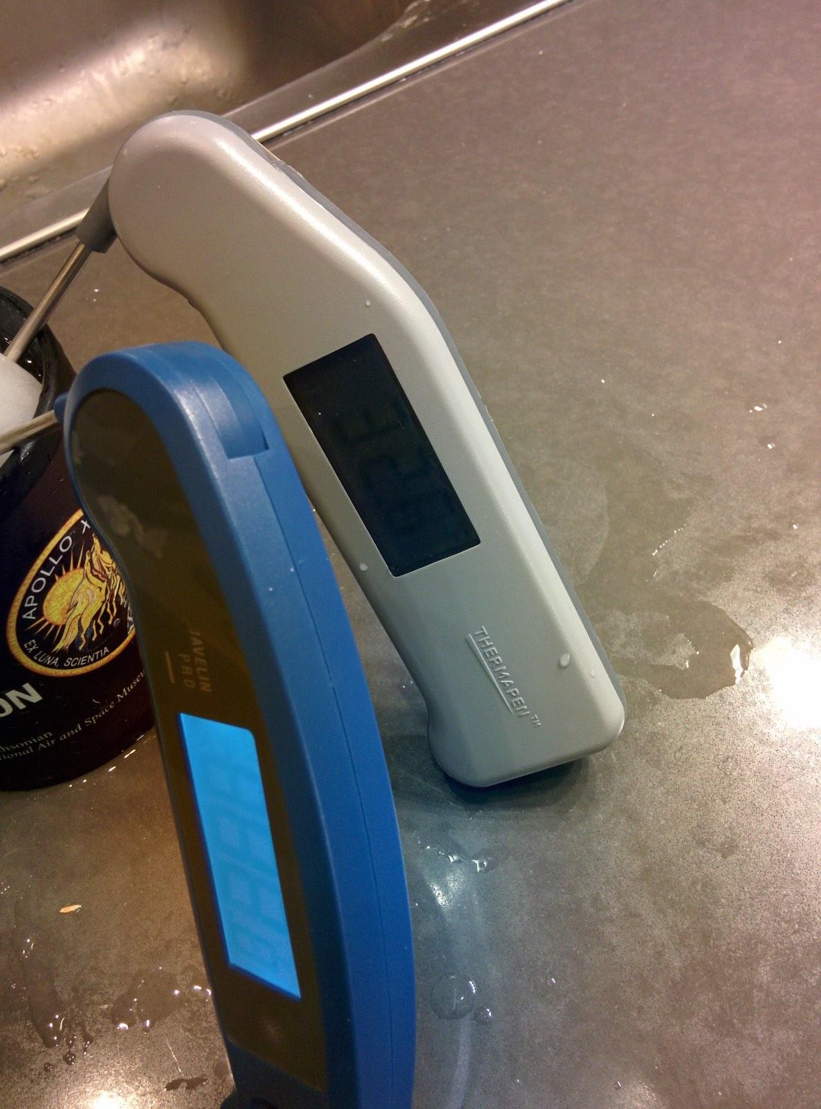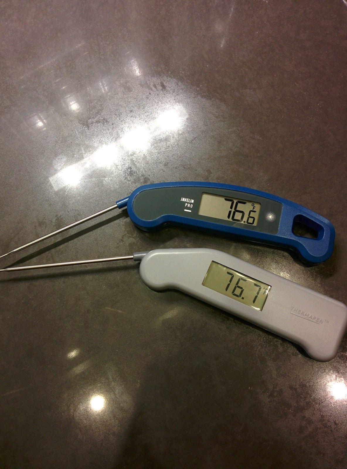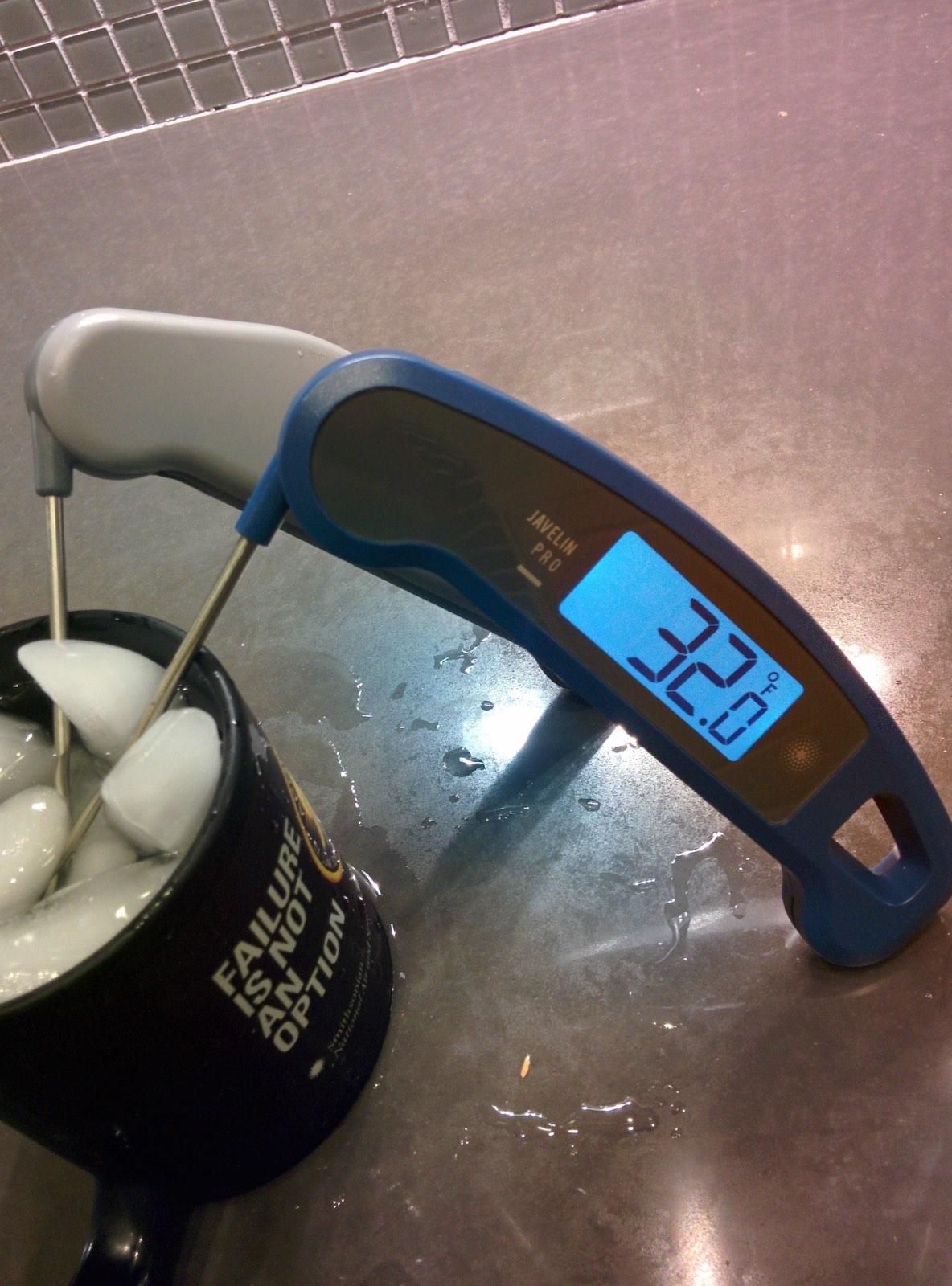 I made a quick ice bath and put both probes in. Accuracy wise, both are effectively the same. I would even venture to say that the javelin is a hair more accurate as I couldn't seem to get my thermapen to hit 32.0 dead. I didn't do a boiling test because I was too lazy. But let's talk speed. My thermapen might but not be the fastest because it's the standard gray, but it surely has got to be faster. Nope! The javelin was neck to neck with the thermapen, both reached 32 within 3 seconds.