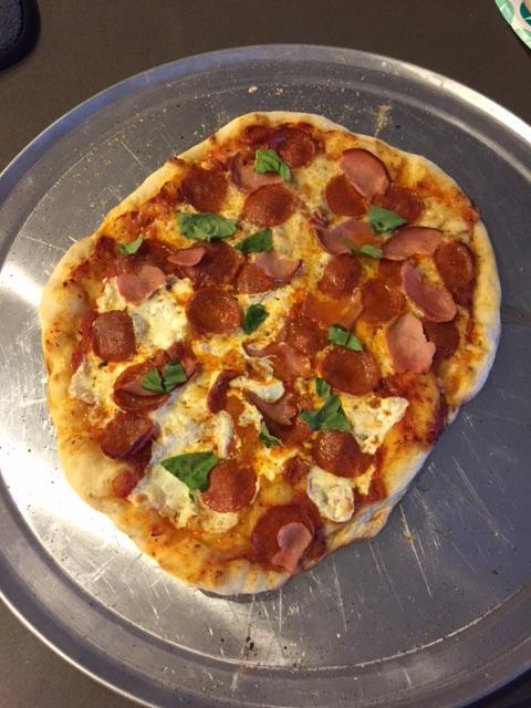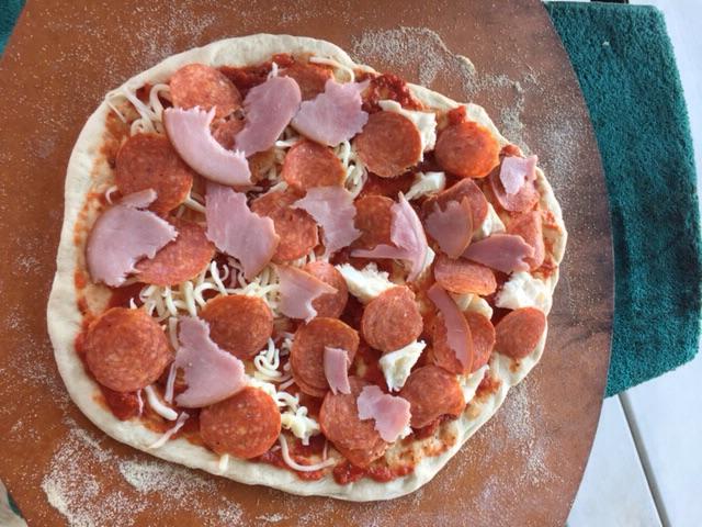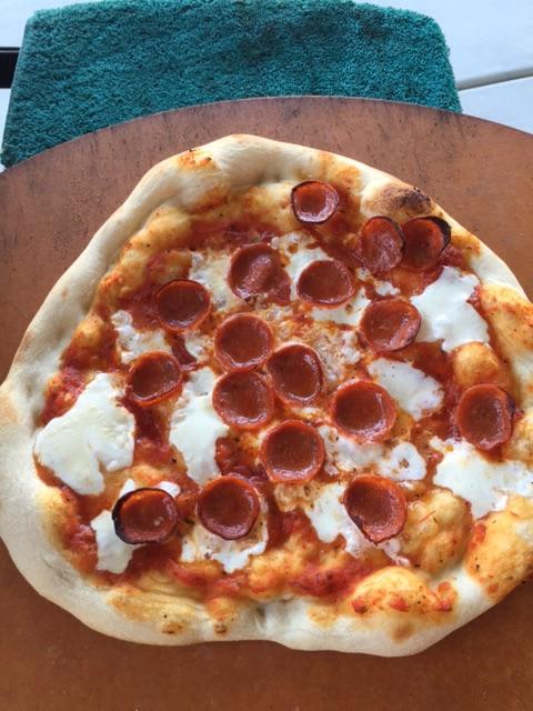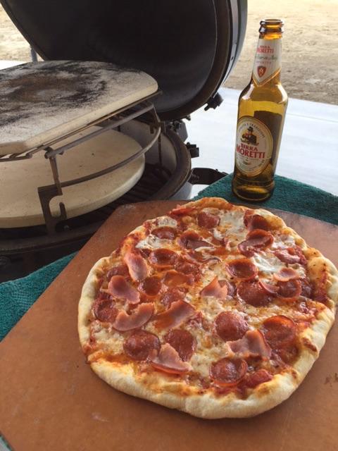 Roberta's dough recipe made yesterday, refrigerated over night. I doubled the recipe. Stones = 15" round on second to lowest setting of the Adjustable Rig with the 13" oval stone on top of the rig extender. I started with the temp up to 650 but found that to be a little hot for this dough recipe. Bottom of one pie got more char than I wanted. Brought the temp down to 550 or so and that seemed better. Pretty generic pies with Boar's Head pepperoni and some with Canadian bacon. This was my first try with the Boar's Head and was definitely better than the pre-sliced run of the mill grocery stuff. A little Italian beer to aid the cook and all was well! I still can't figure out how to get the right sequence down when posting pics so I apologize for the order.