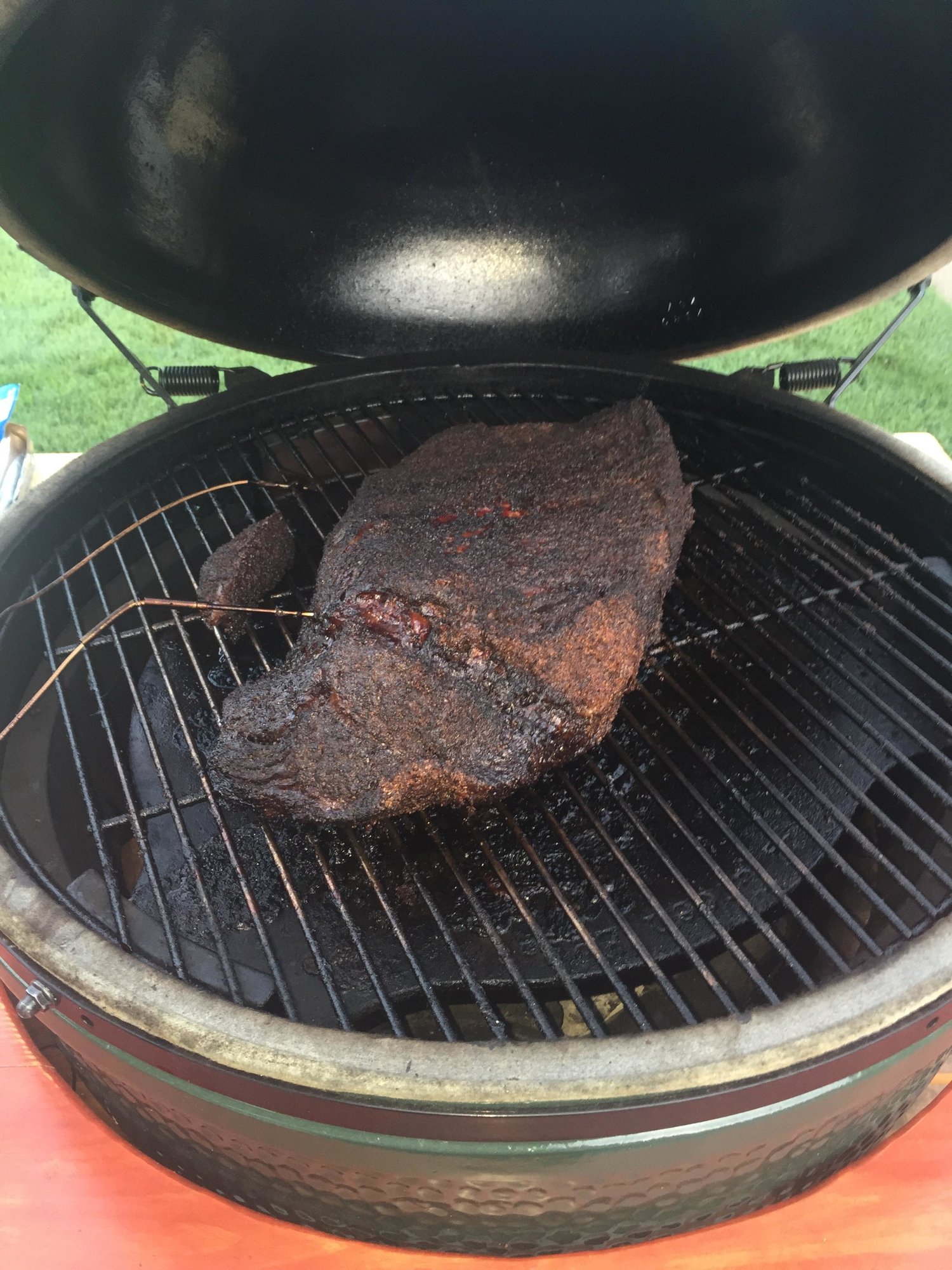 I I think I determined that my main problem on the first cook was not enough fuel. Filling the fire box to where I did worked great. In fact, it is still going now. I put some sausage links on the grill after I took the brisket off.XL and Med Eggs