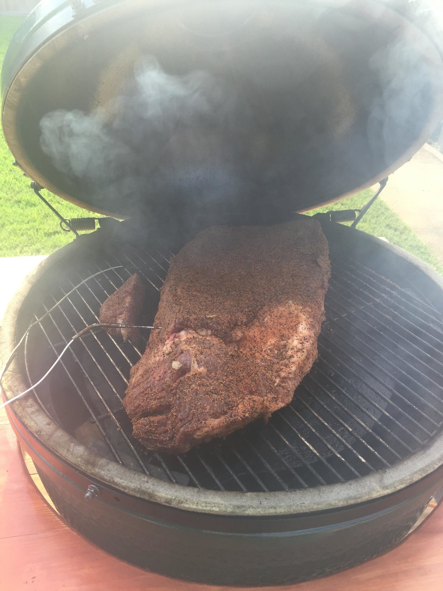 Please do think about using a drip pan elevated a little above the plate setter - not for water, but to catch the fat drippings. Fat dripping onto hot coals will yield a good taste, but smoking fat on a hot plate setter ... not so much.