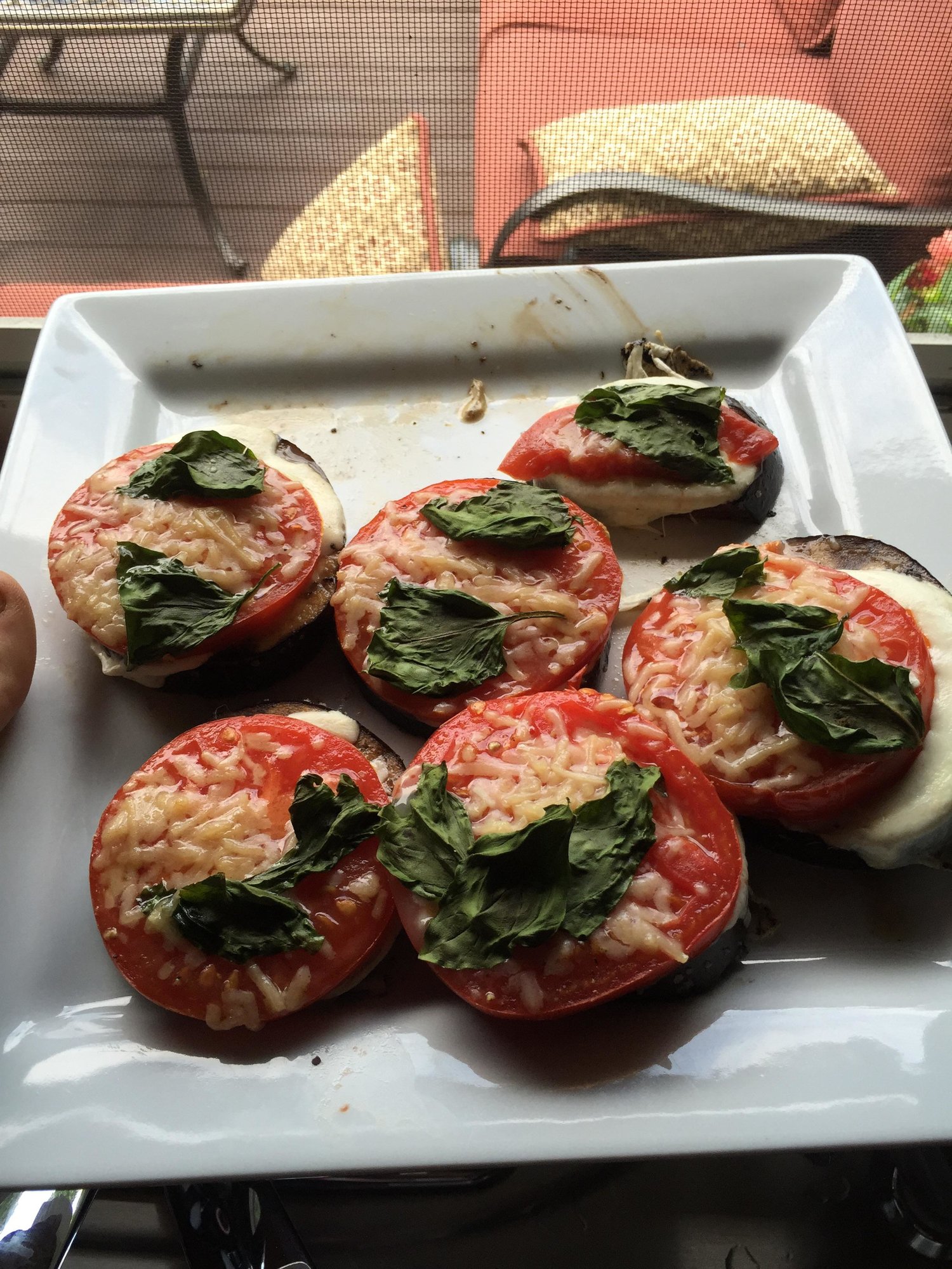 Cut eggplant half inch thick. Coat with some evoo and salt and pepper. Cook for ten minutes. Flip and add mozzarella, tomato, more mozzarella and shredded parm with a basil leaf. In that order. Cook for another ten or so. Ez peezy.LBGE& SBGE———————————————•———————– Pennsylvania / poconos
