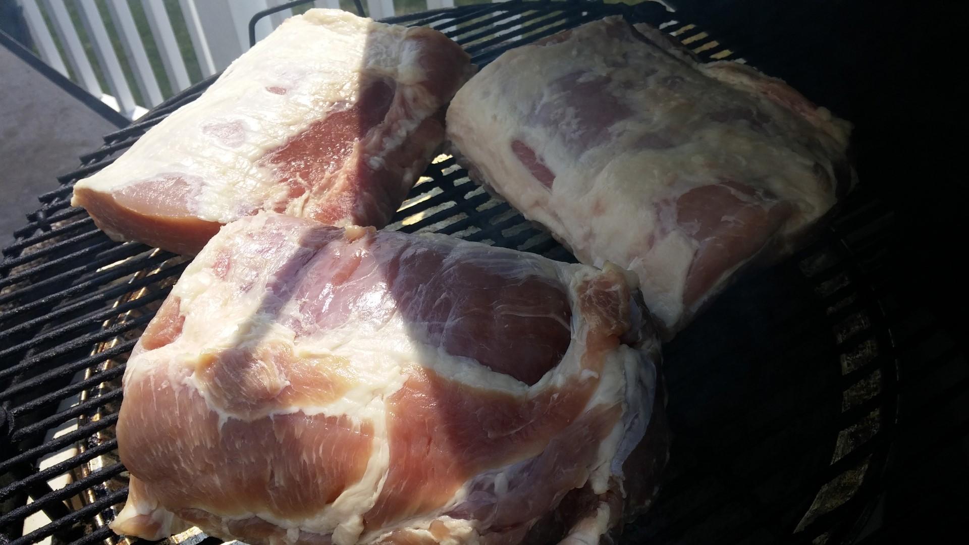 Today after it had set in the fridge and developed a nice pellicle I put it on the XL raised high in the dome at around 235* with cherry wood chunks for smoke.