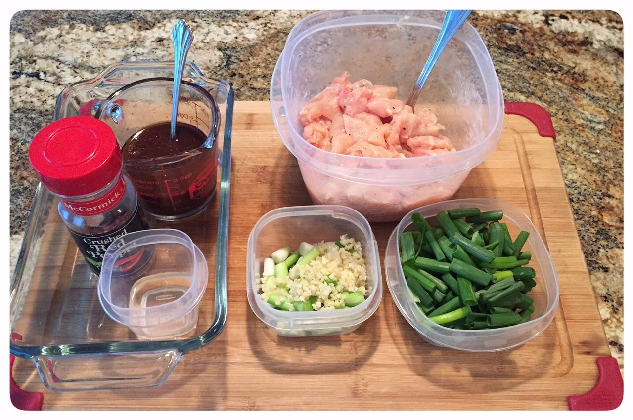 The cast of characters are chicken with a little cornstarch, salt & pepper, green onions,garlic,rice vinegar,red pepper flakes and a sauce made from hoisin sauce,soy,sesame oil and water.