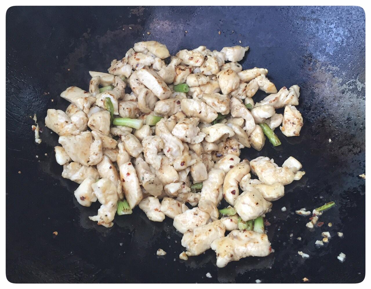 Now it's time for some wokkin. Chicken is almost done so in goes the whites of the green onions & some garlic
