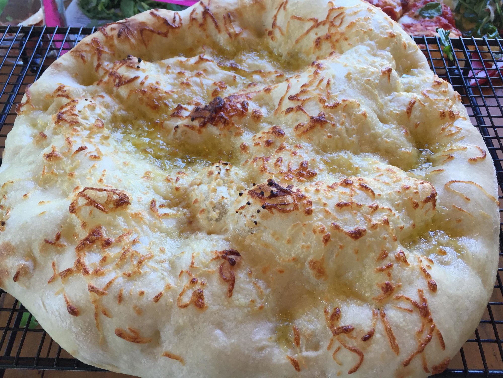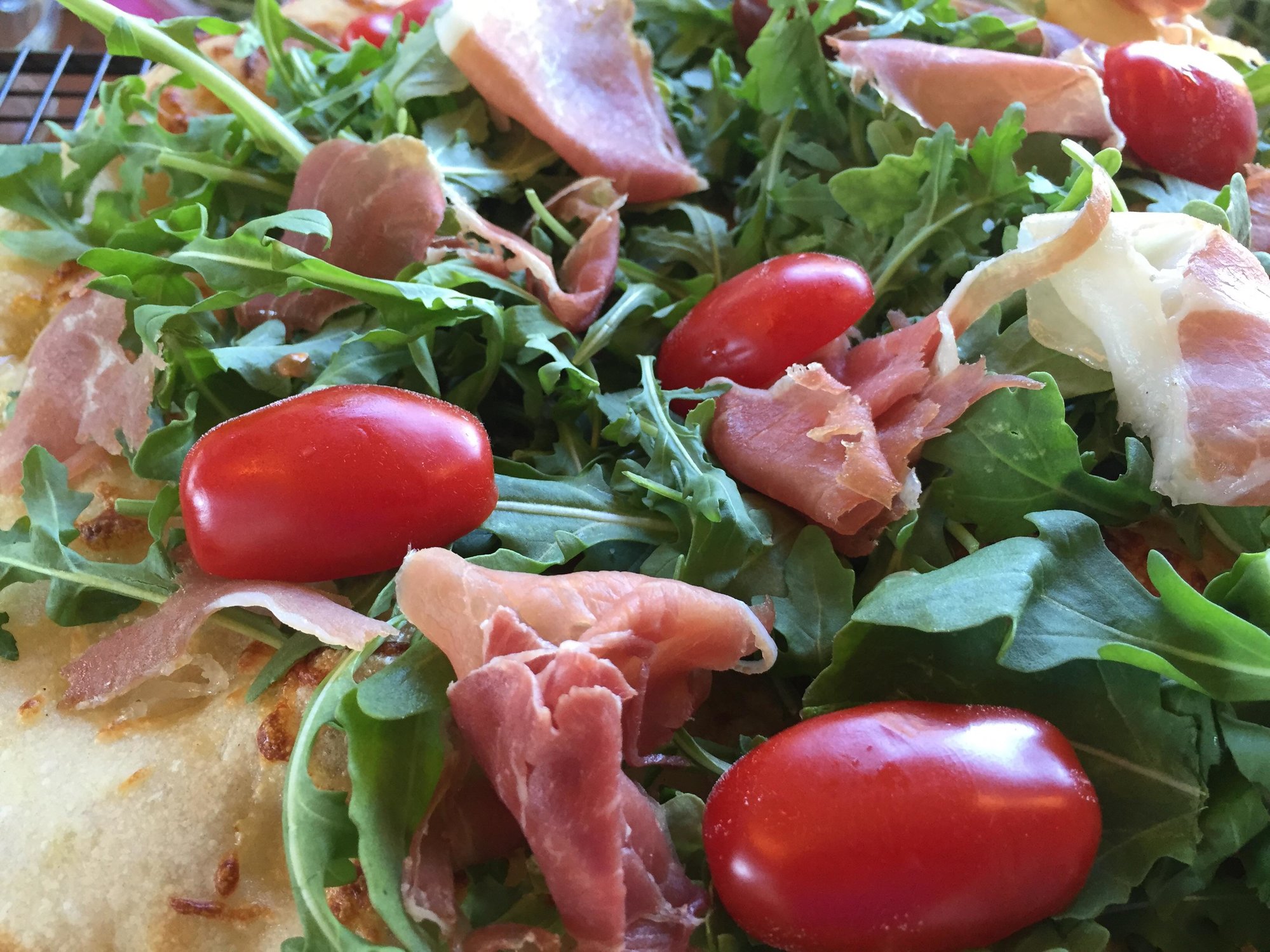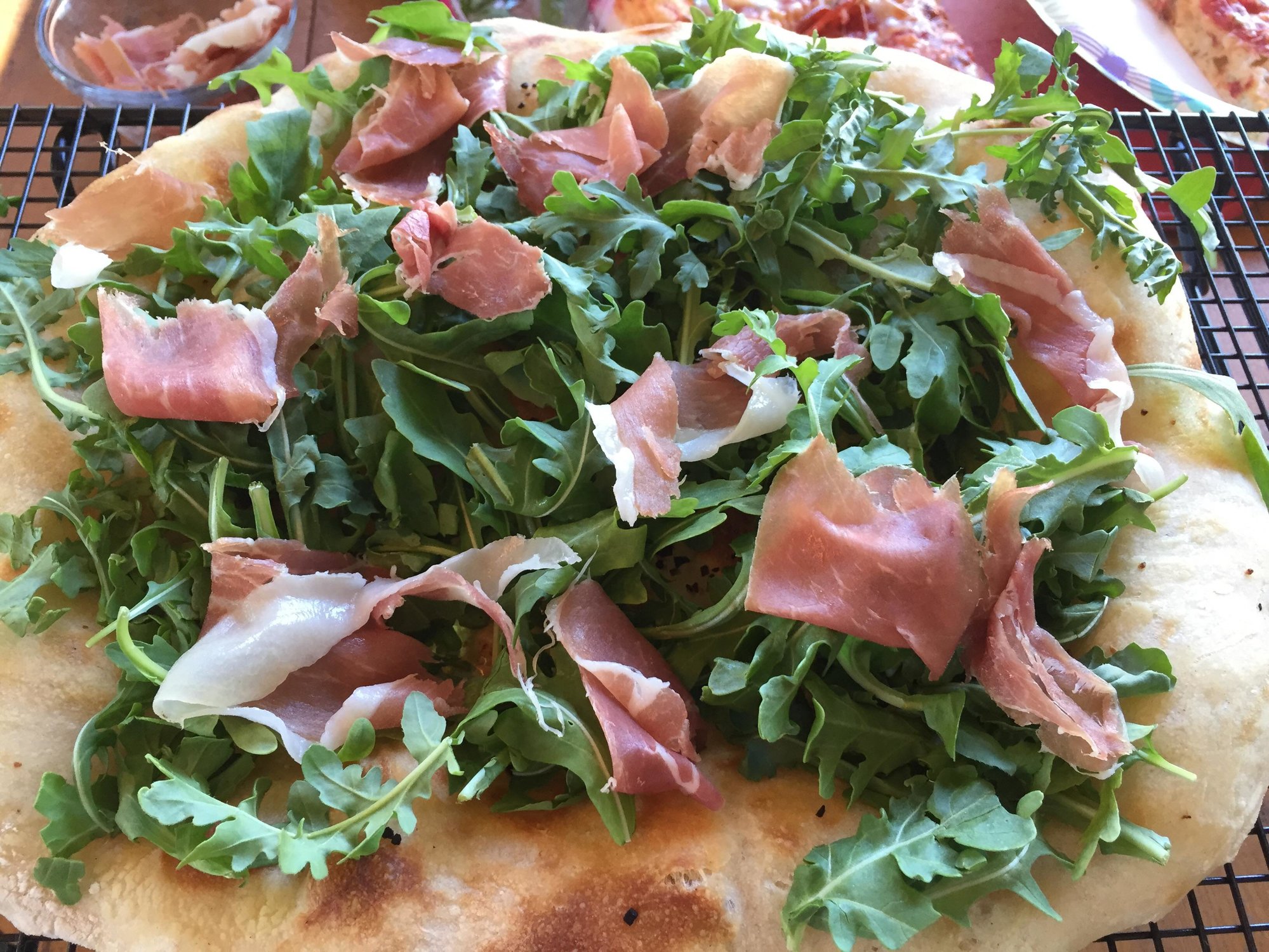 Pizza 2: olive oil, garlic, arugula, prosciutto.
