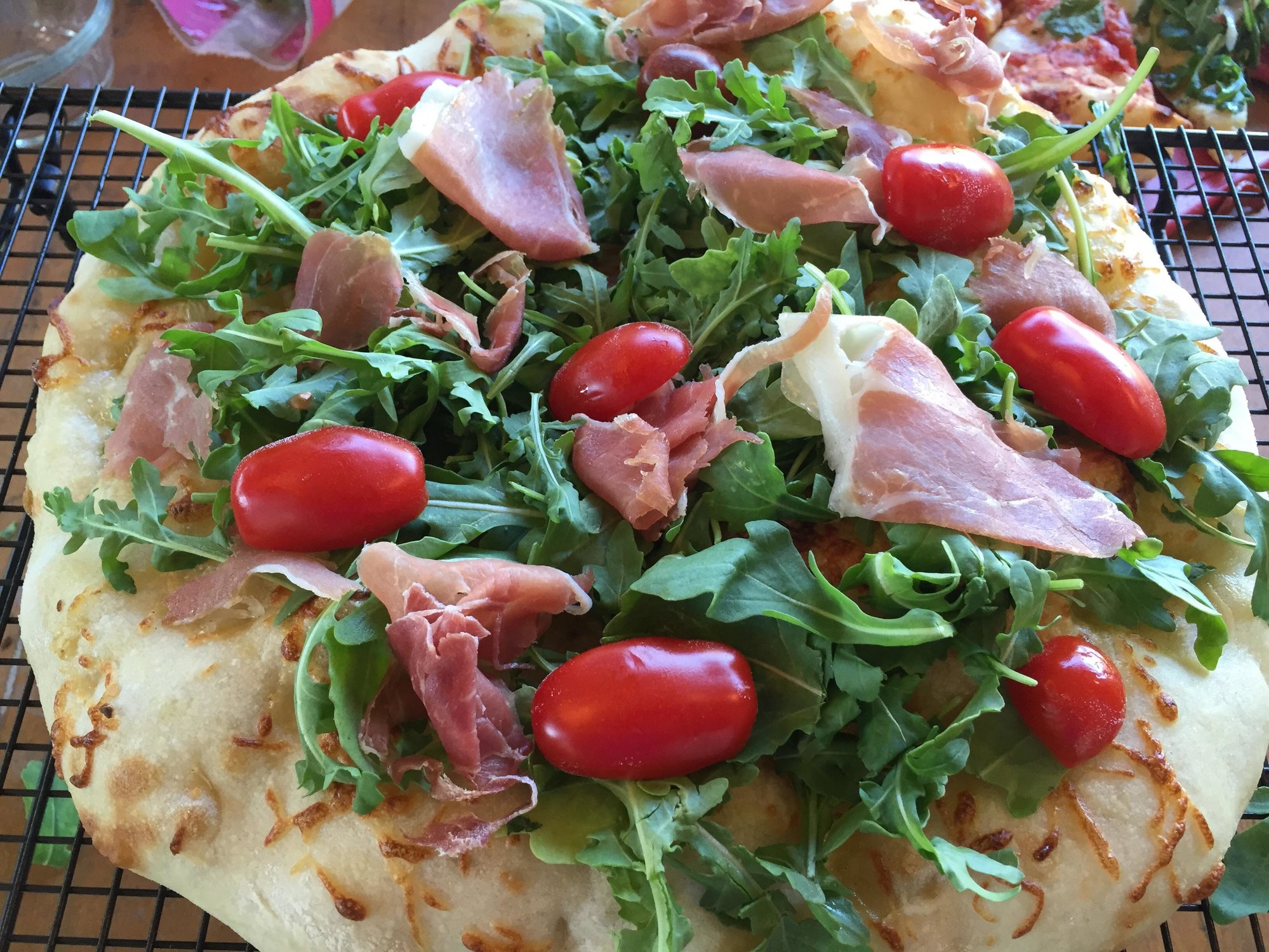 Pizza 4: olive oil, garlic, three cheese Italian mix, arugula, prosciutto, fresh tomatoes