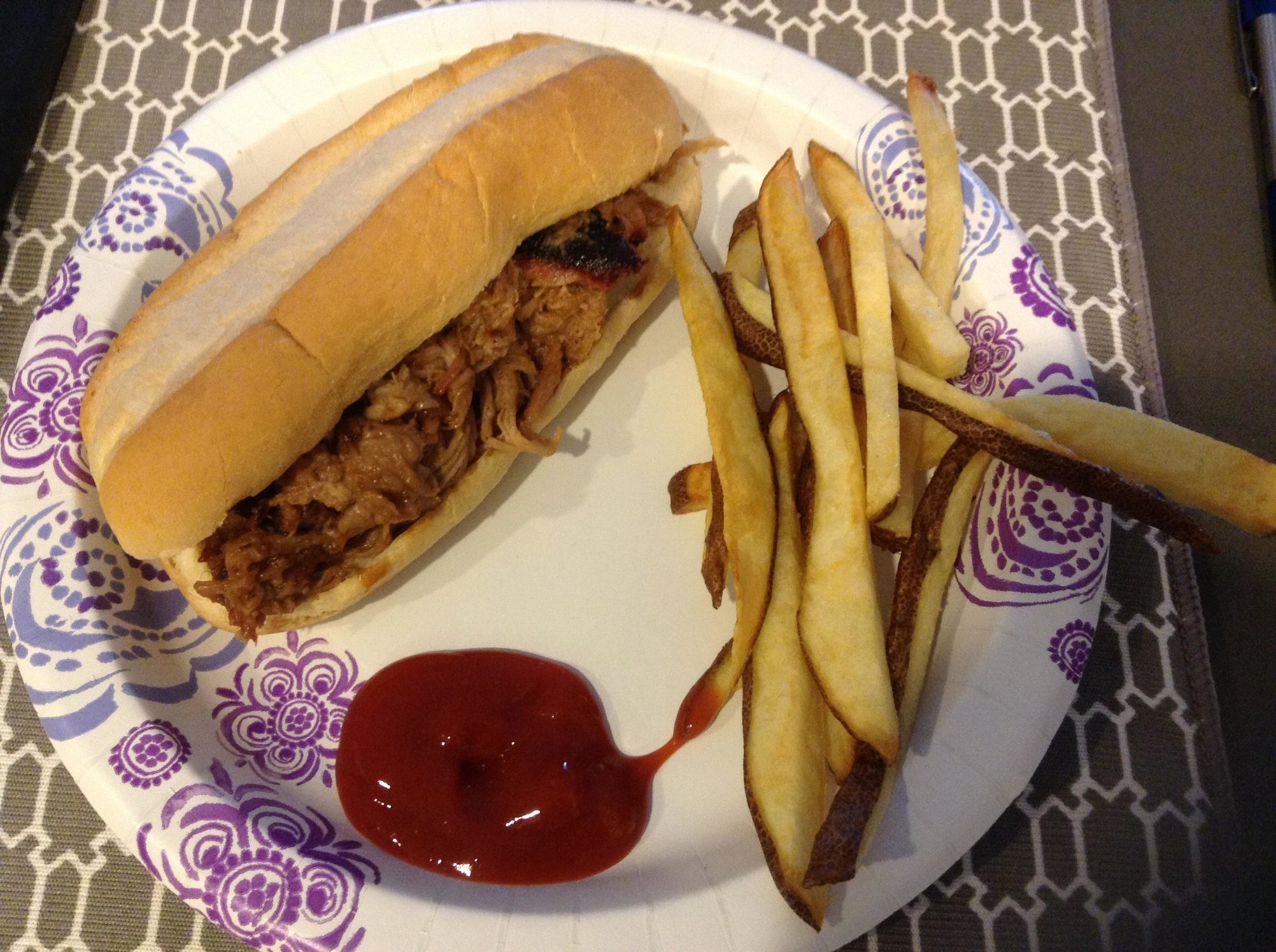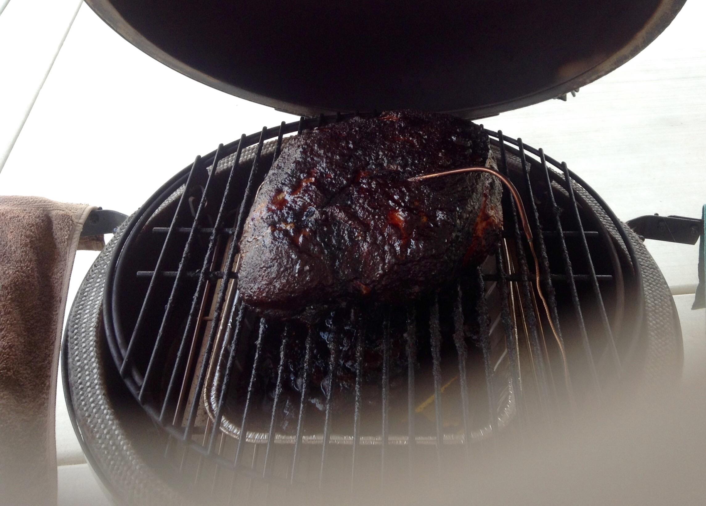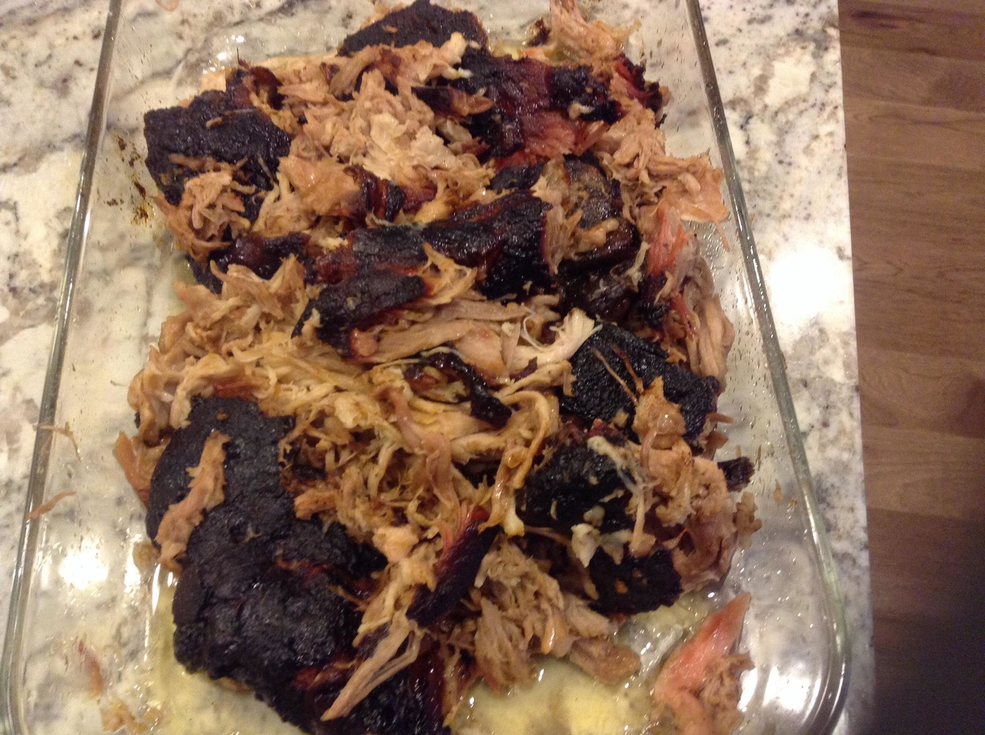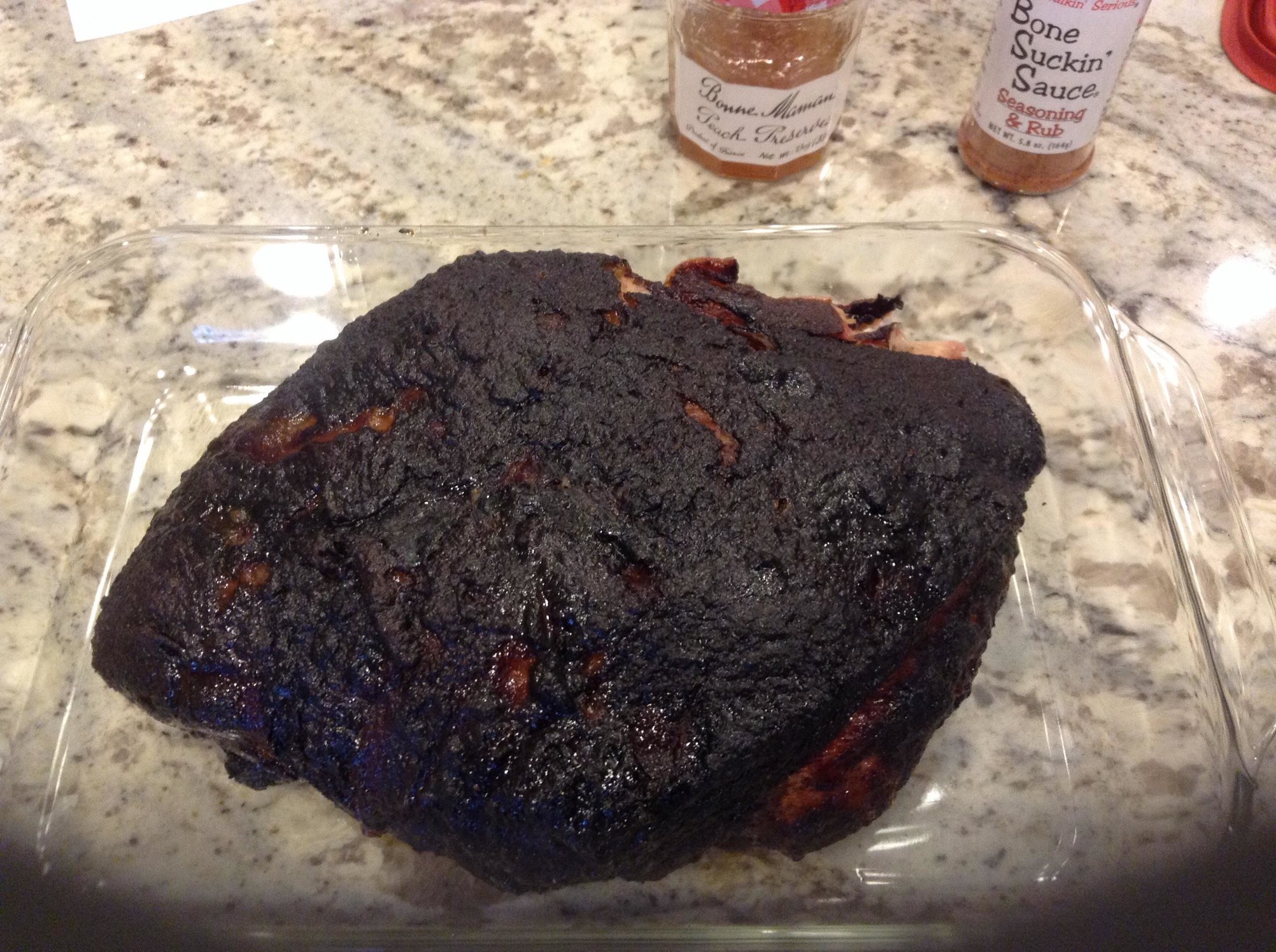 I picked up an 8lber on Friday from one of the local meat markets. I did a pizza cook earlier in the evening so I had to wait for the egg to get back down to a low temp before reloading the egg with lump. Seasoned with Memphis rub and bone sucking rub and peach preserves all over.   (thanks to @YukonRon for his great write up) After getting the egg to 225 dome and holding for about 30 min I put the butt on indirect with an aluminum pan with a small amount of water underneath. Butt was on the adjustable rig on the highest level.  Cook started at 10 P.M. And I waited up til 12 to make sure I was holding temp. I set my alarm for 3 to ck on things and of course dome temp dropped to 150. I removed the AR, stoked the fire and got it back to 225 after 30 min. Temp held fine after this, although I would def change to 250 degrees to begin with to cut the cook time. Finally got to 200 internal temp at the 20 hr mark. The rest of the dinner was homemade fries on our finest paper plates!  And some great Shipyard pumpkin head ale!  Enough talk, here are the pics: