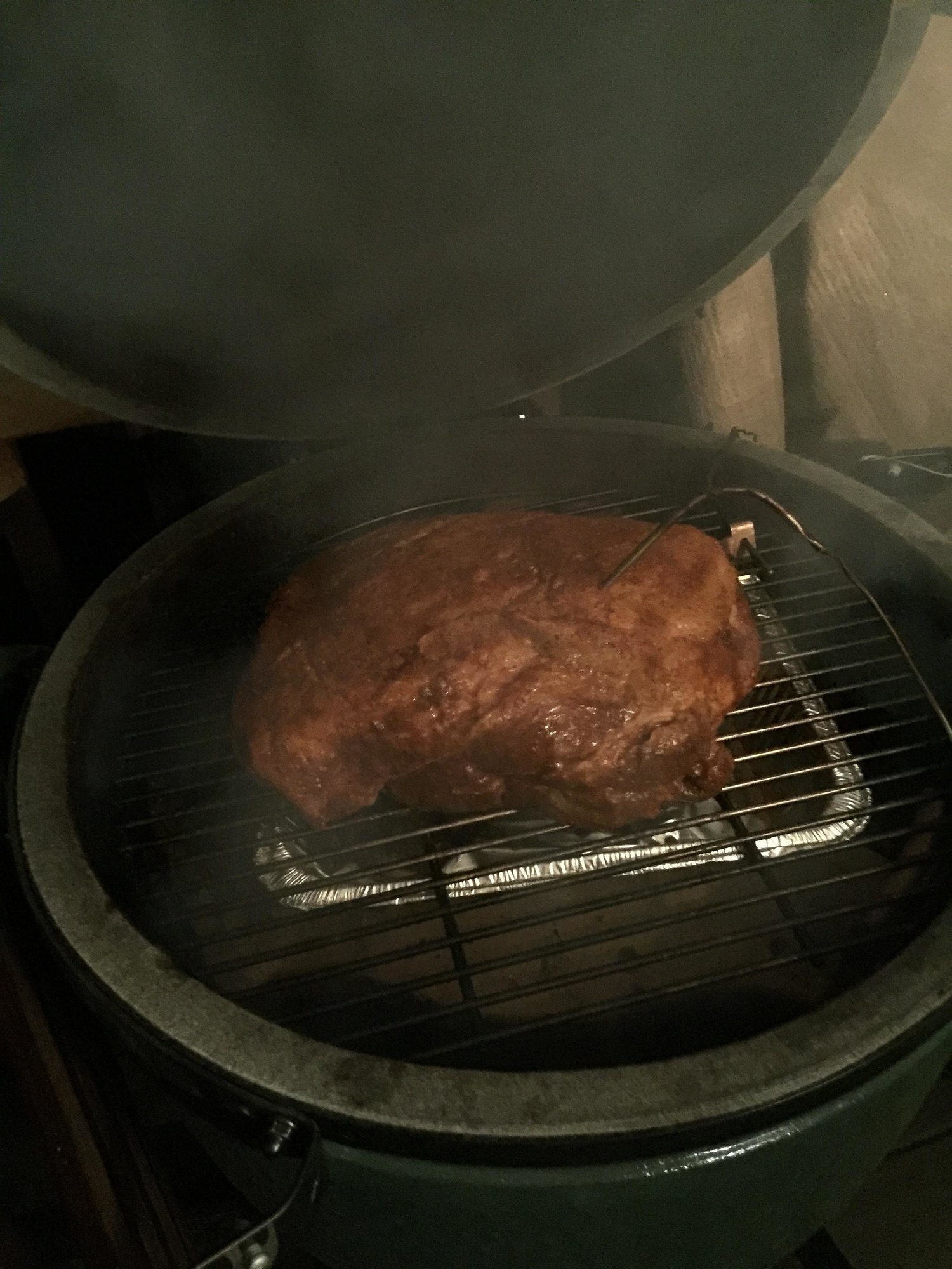 15 hours at 225 - 250. Put on at 9:30 Saturday night, pulled today at 12:30 at a 197 IT (30 mins before game time). Everybody liked it, so a success!