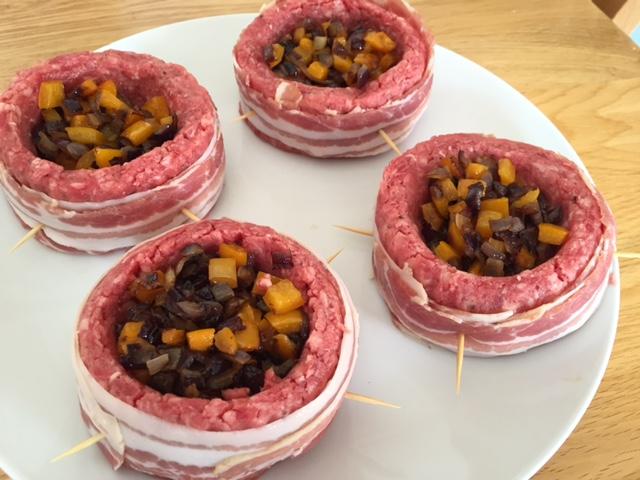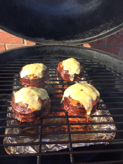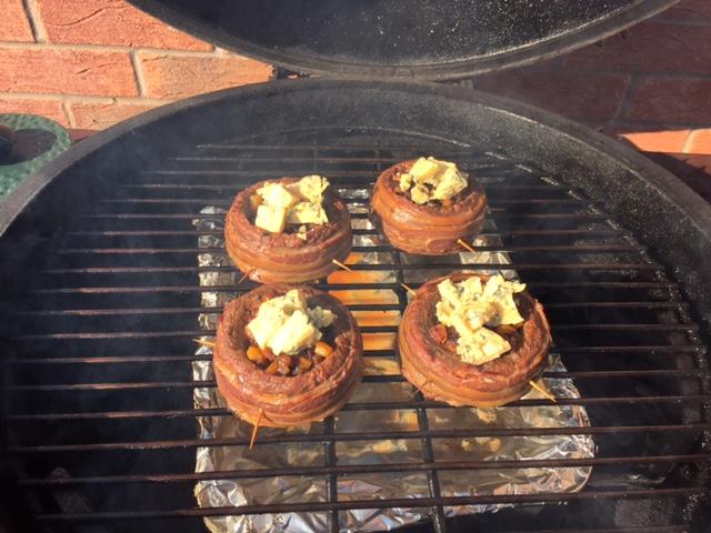 All I can say is that these were very successful. I used onion and yellow pepper for the filling and then black-sticks blue cheese and a strong cheddar topper. I used a handful of hickory chips to smoke them. They were MIGHTY!